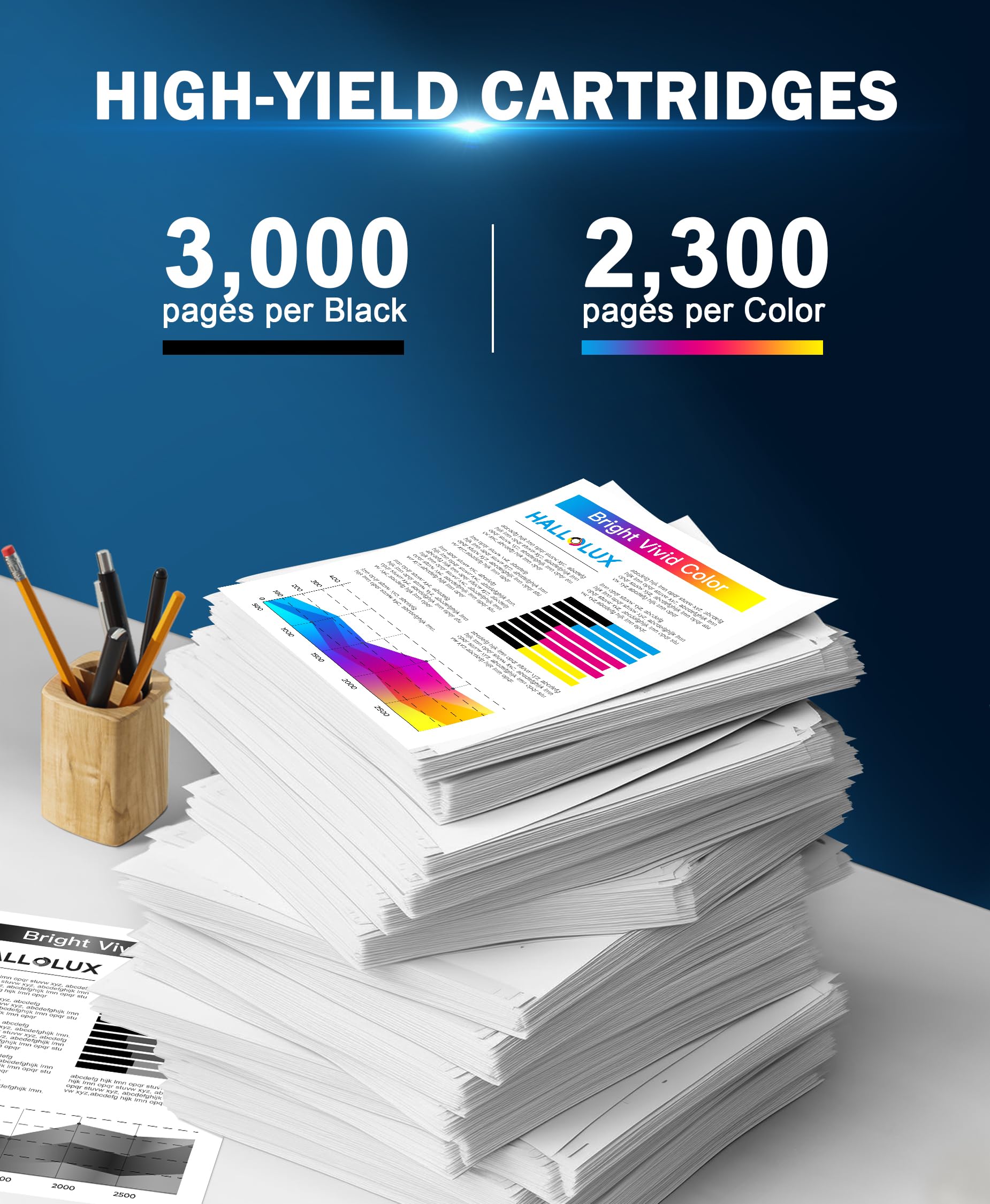 - Hohe Reichweite: Drucken Sie bis zu 3'000 Seiten in Schwarz und bis zu 2'300 Seiten pro Farbe (bei 5 % Deckung), ideal für ein hohes Druckaufkommen.