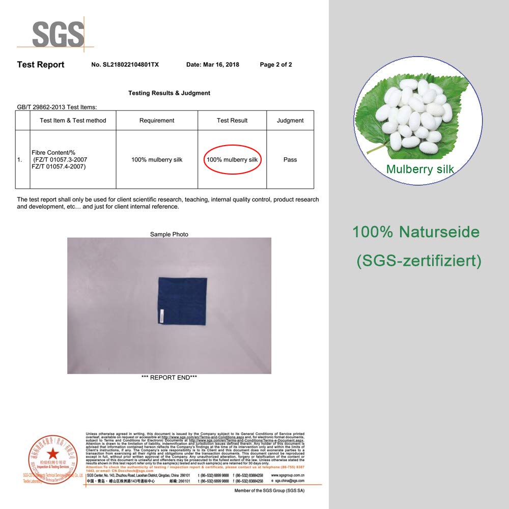 - 100% reine Naturseide: Das Material ist aussergewöhnlich weich, glatt und hautfreundlich. Dank natürlicher Proteine beugt es Hautreizungen vor und erzeugt keine statische Elektrizität.