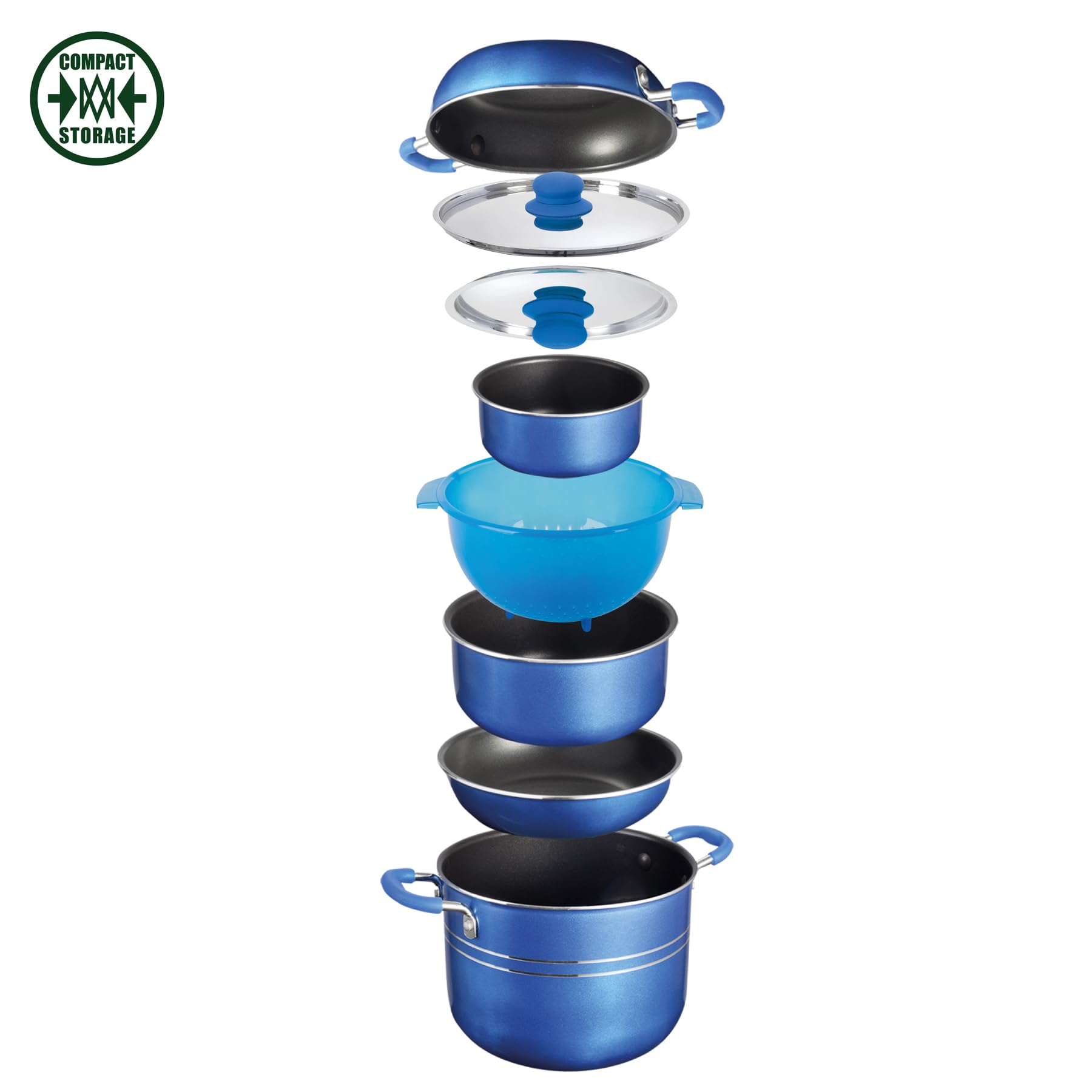 Durch sein geringes Gewicht, das kompakte, stapelbare Design und die umfassende Ausstattung ist das Set der perfekte Begleiter für Camping, Caravaning und Outdoor-Abenteuer, bei denen sowohl eine volle Kochausstattung als auch minimaler Platzbedarf im Gepäck wichtig sind.