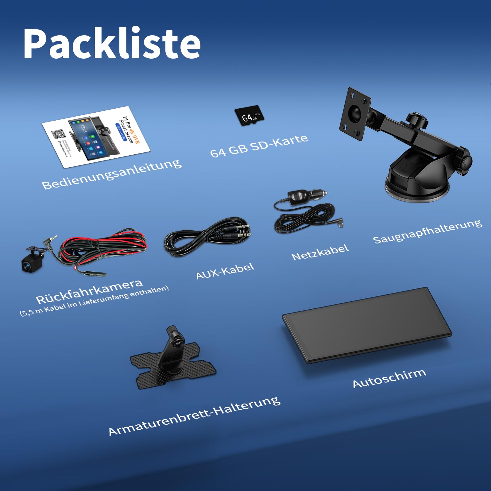 - Integrierte 4K-Dashcam und Rückfahrkamera: Das System ist mit einer hochauflösenden 4K-Frontkamera und einer 1080p-Rückfahrkamera ausgestattet. Es zeichnet Ihre Fahrten kontinuierlich auf und sichert im Falle eines Unfalls wichtige Videobeweise. Dank der Loop-Aufnahme werden alte Daten automatisch überschrieben, wenn die mitgelieferte 64 GB TF-Karte voll ist.