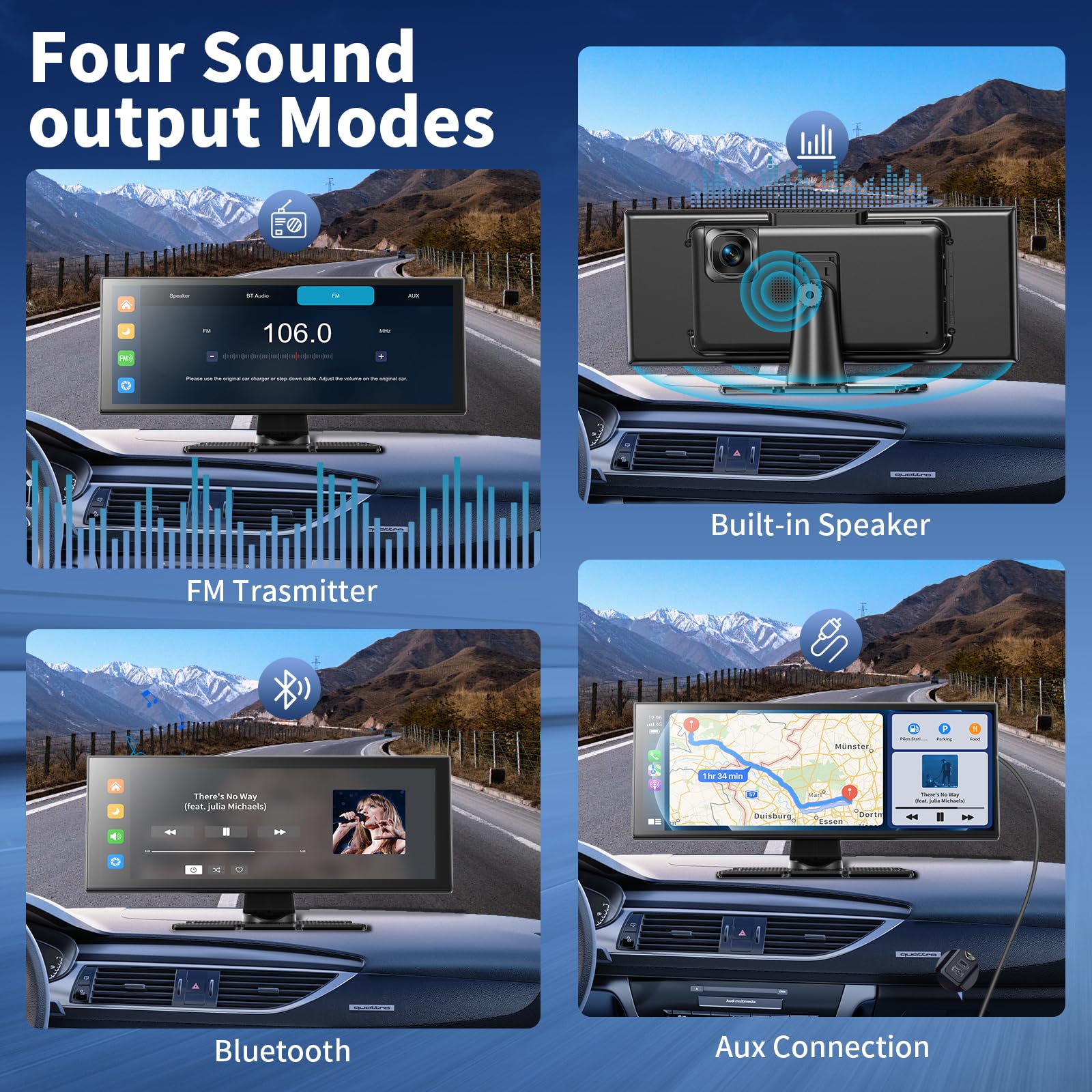 Das Display bietet mehrere Optionen. Es hat einen eigenen Lautsprecher, kann den Ton aber auch kabellos per FM-Transmitter an Ihr Autoradio senden oder für die beste Klangqualität direkt per AUX-Kabel mit dem Audiosystem Ihres Fahrzeugs verbunden werden.