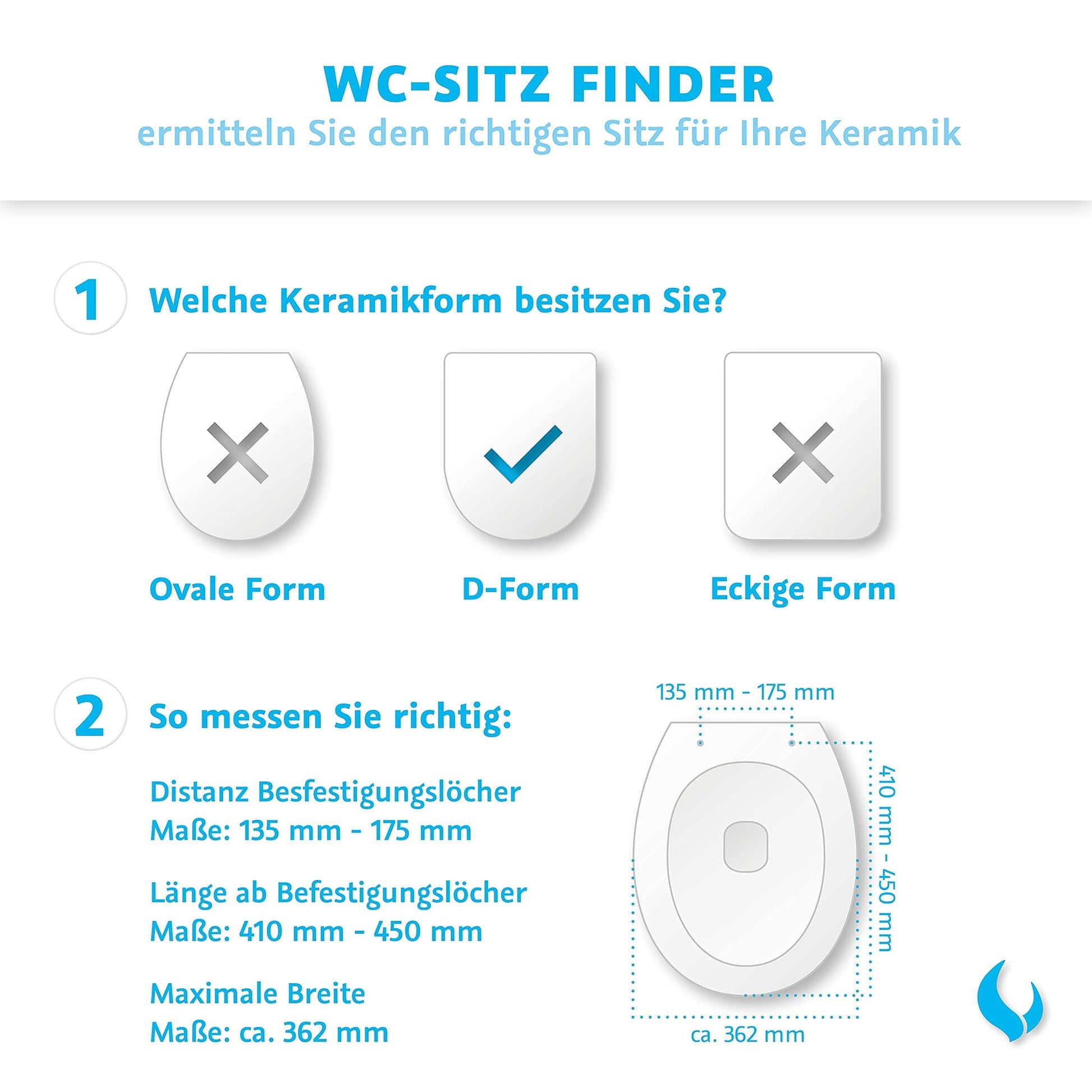 - Passform: Geeignet für D-förmige WC-Keramiken mit einem Montagelochabstand von 13,5 cm bis 17,5 cm.