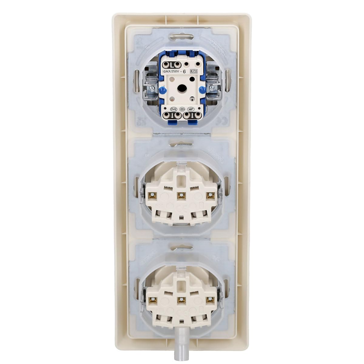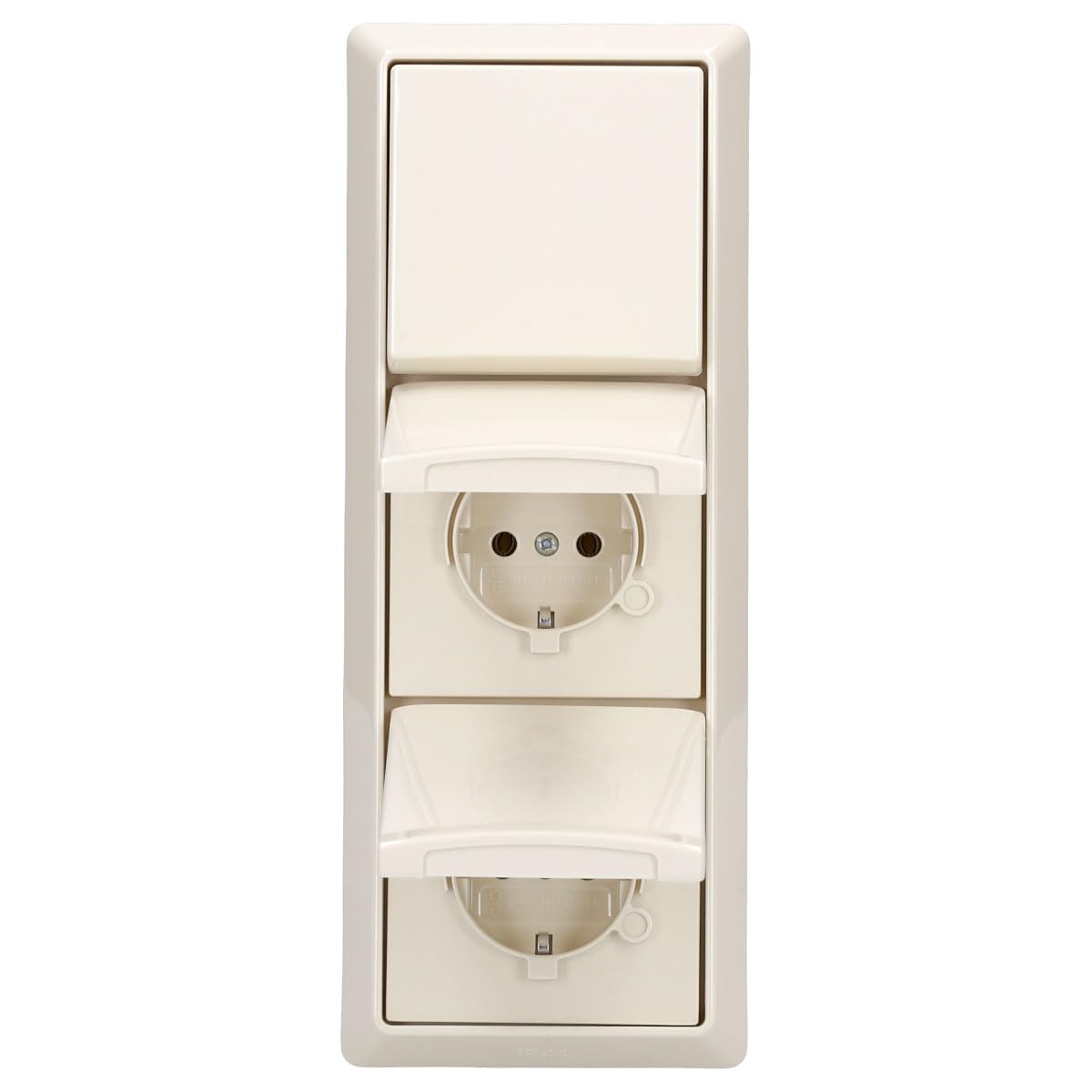 Das Set beinhaltet eine komplette 3-fache Kombination für die Unterputz-Installation: zwei wetterfeste SCHUKO-Steckdosen (20 EUGK-32-101) mit Klappdeckeln, einen Wippschalter-Einsatz (2000/6 US) mit passender Wippe (2106-32) und den dazugehörigen 3-fach Abdeckrahmen (2103-32) in Weiss.