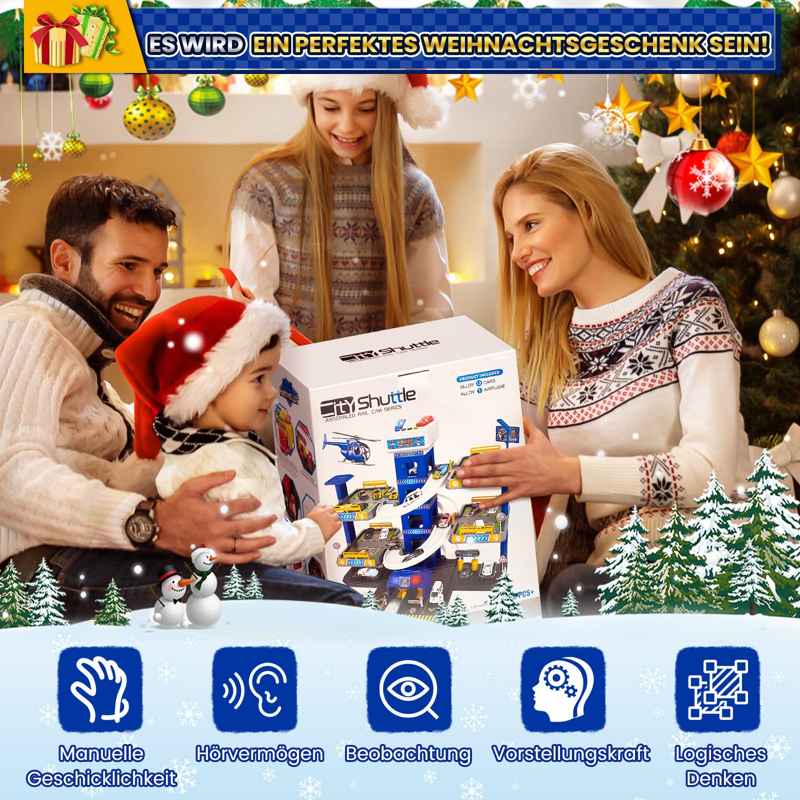 Das Komplettset beinhaltet das 5-stöckige Parkhaus mit Aufzug und Rennstrecke, 14 robuste Metallautos, 2 Helikopter sowie eine grosse Spielmatte, die als detailreiche Spielwelt dient und gleichzeitig den Boden schützt.