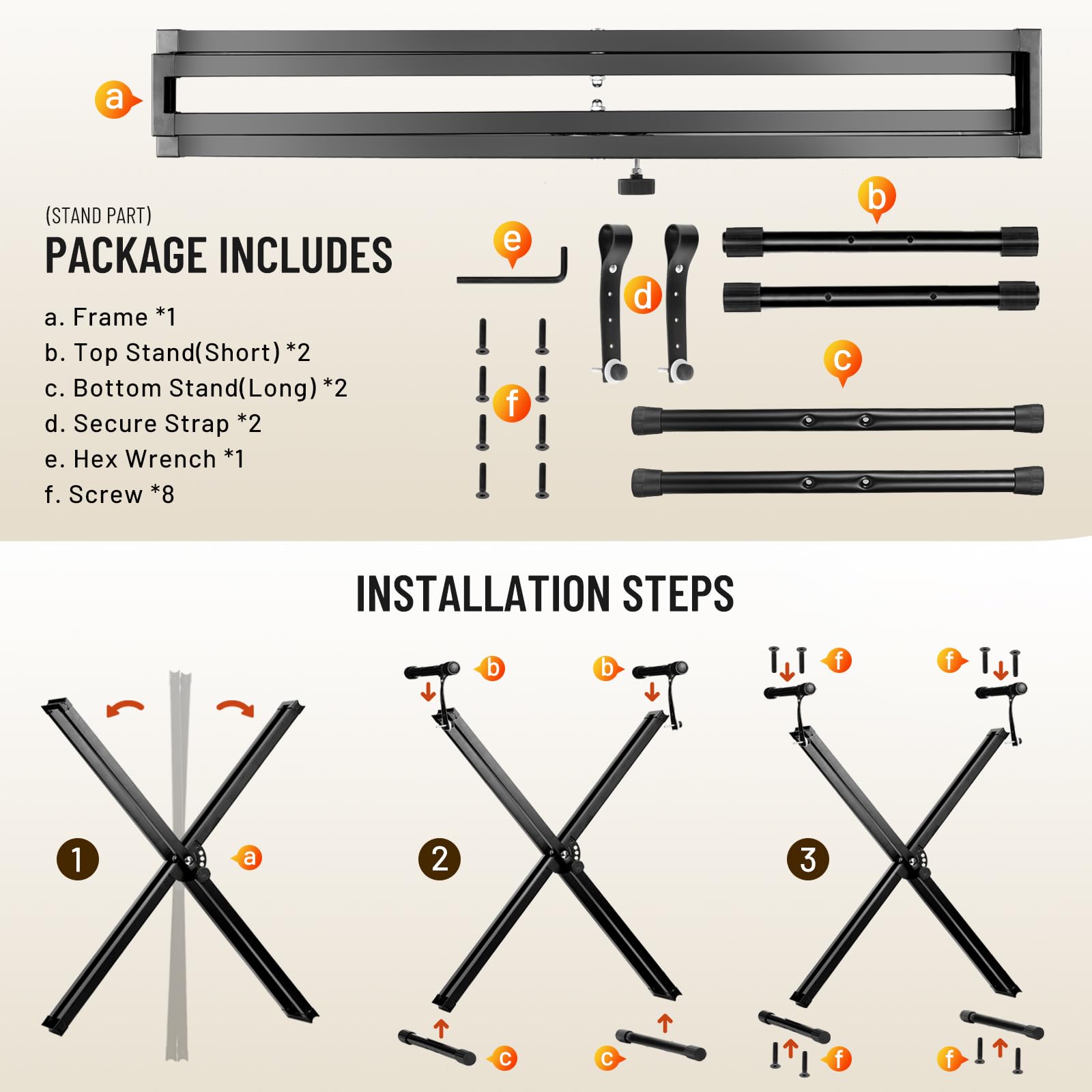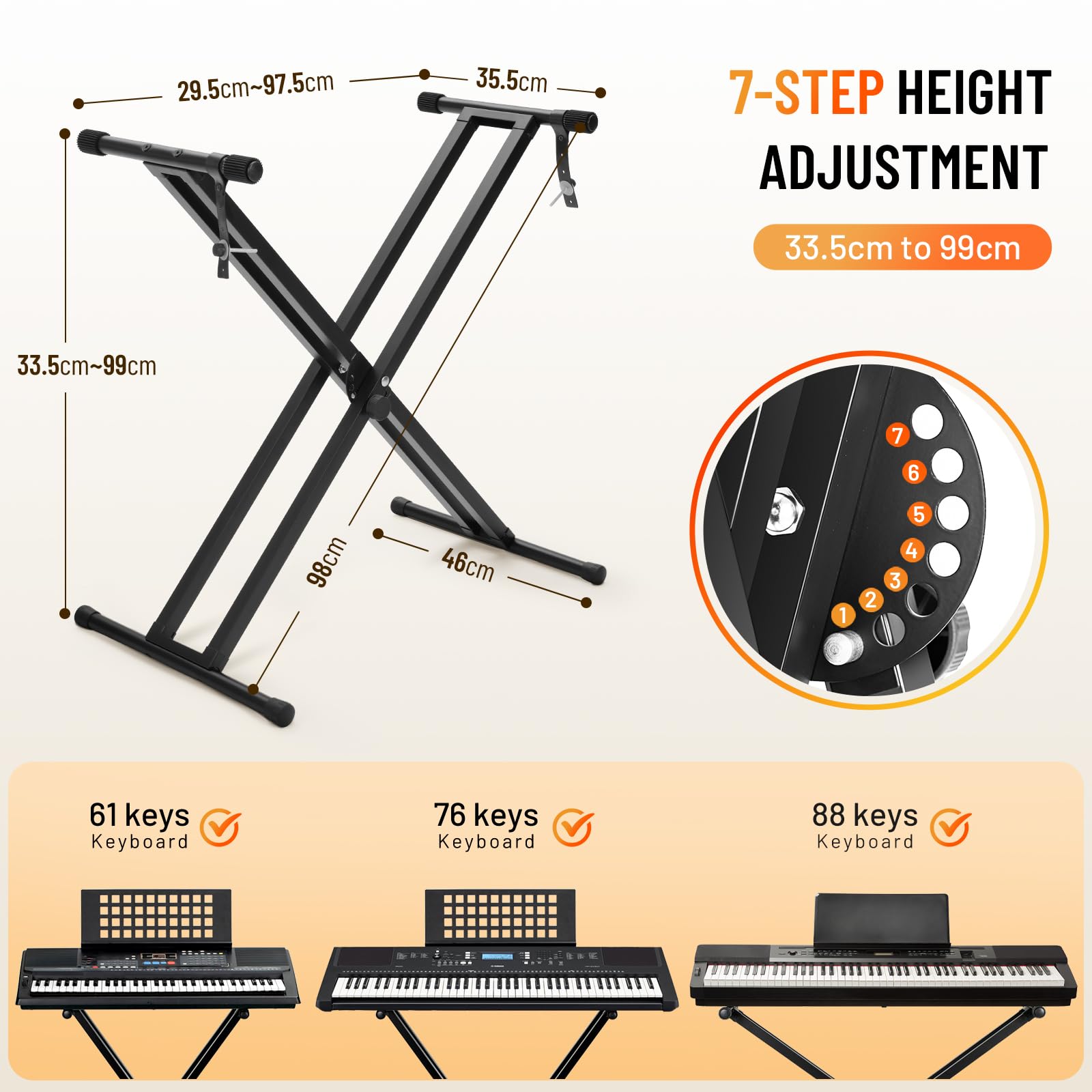 - Flexibler Keyboardständer: Der Doppel-X-Ständer lässt sich in 7 Stufen von 33,5 cm bis 99 cm in der Höhe justieren. Die Breite ist ebenfalls variabel von 29,5 cm bis 97,5 cm, passend für die meisten Keyboards mit 61, 76 oder 88 Tasten.