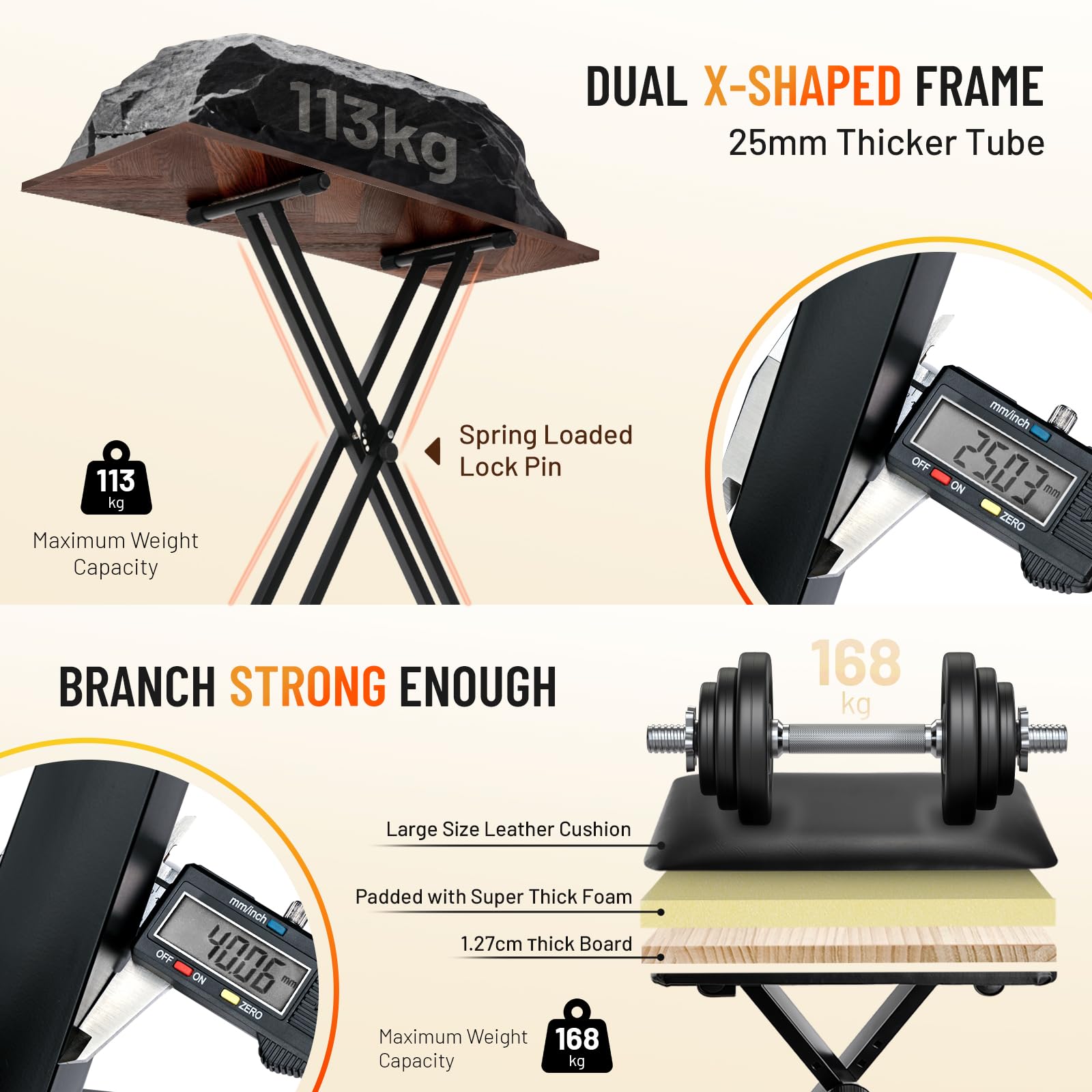 Stabilität und Sicherheit: Die robuste Doppel-X-Konstruktion des Ständers gewährleistet einen sicheren Halt für Ihr Instrument bis zu 113 kg. Die solide gebaute Bank trägt sogar bis zu 168 kg, sodass Sie sich auch bei energischem Spiel voll und ganz auf Ihre Musik konzentrieren können.