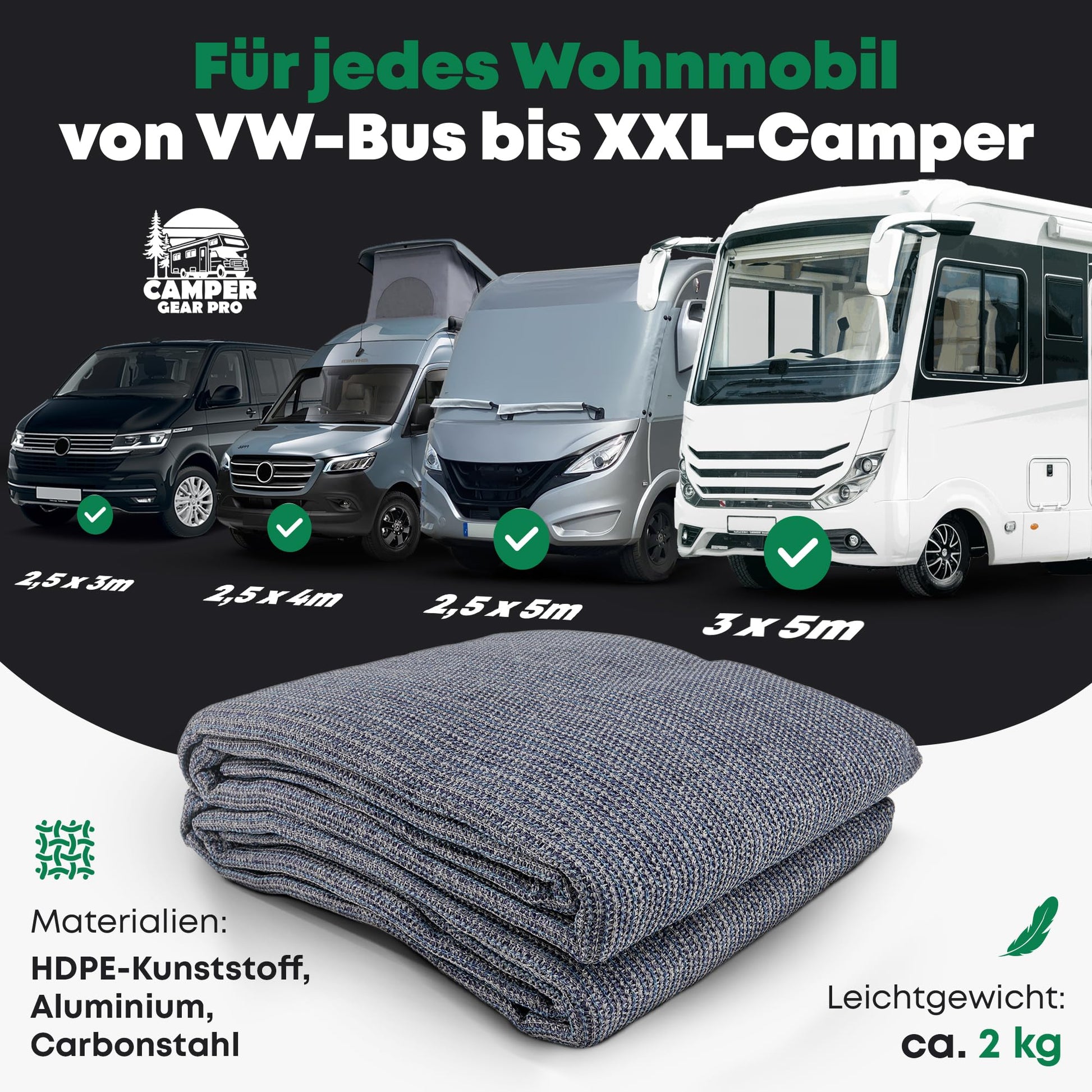 Dieser Vorzeltteppich von Camper Gear Pro ist die ideale Lösung für einen sauberen und stabilen Aussenbereich vor Ihrem Wohnmobil, Wohnwagen oder Zelt. Das durchdachte Komplett-Set bietet alles, was Sie für eine sichere und komfortable Installation benötigen.