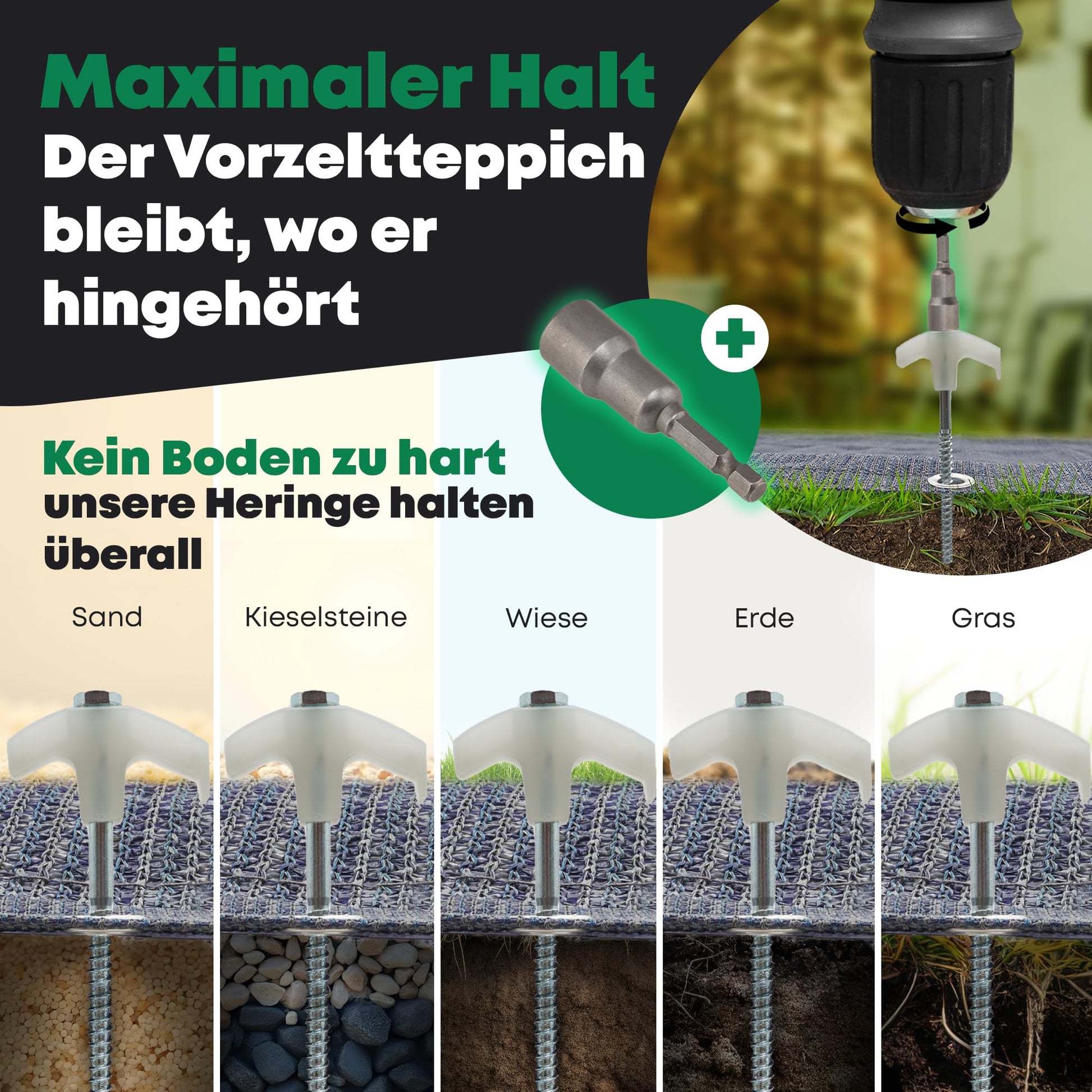 Sicherer Stand auf jedem Untergrund: Vergessen Sie brüchige Plastikheringe. Unsere mitgelieferten Heringe aus Carbonstahl sind praktisch unzerstörbar. Dank des beiliegenden Akkuschrauber-Aufsatzes lassen sie sich selbst in härteste Böden mühelos eindrehen und garantieren so einen bombenfesten Halt für Ihren Teppich.