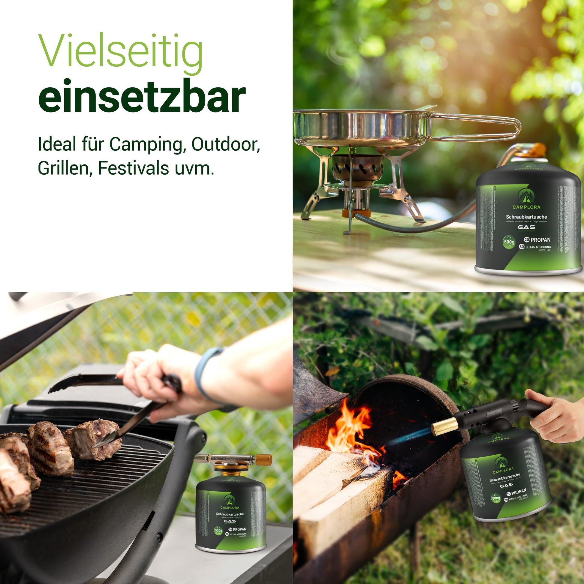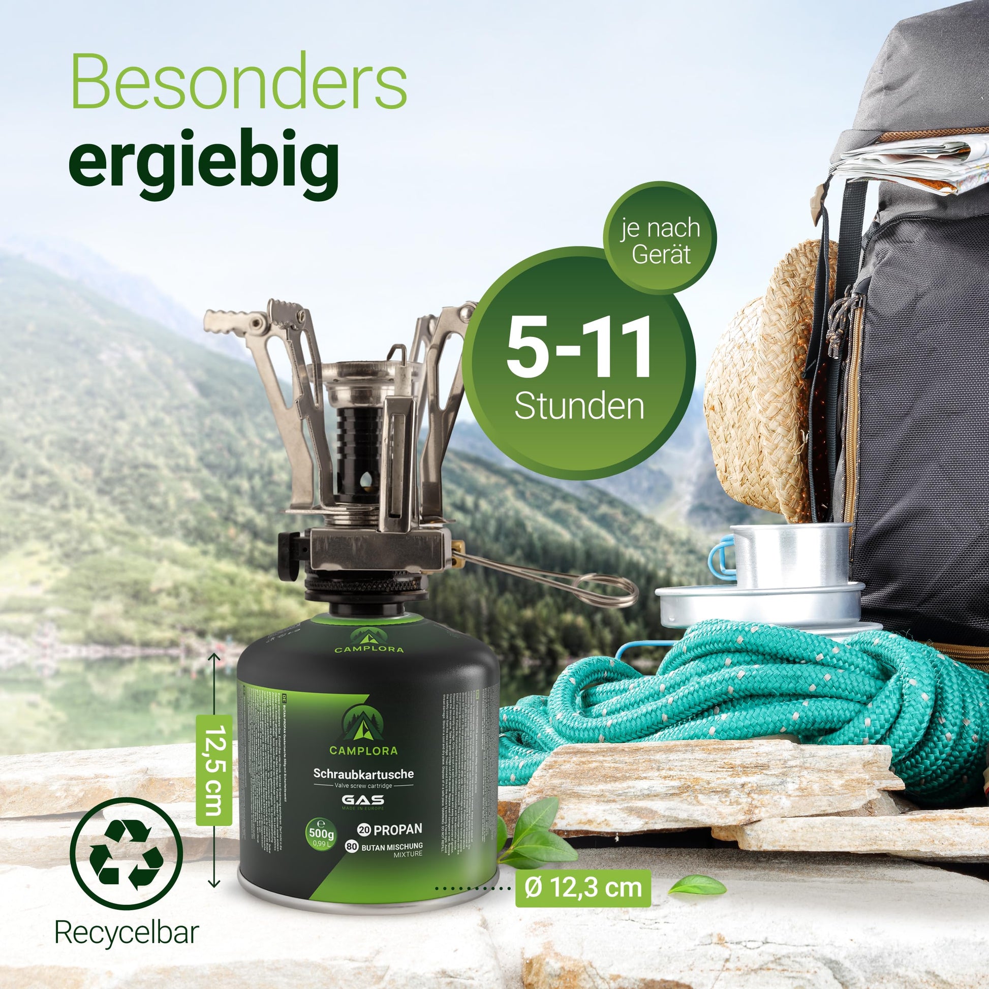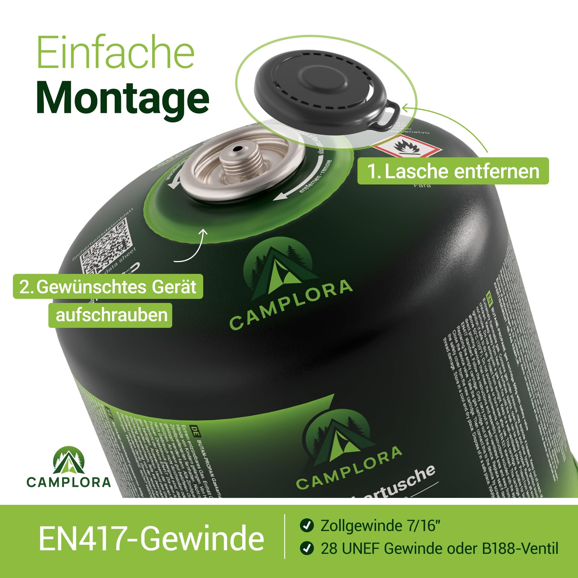 Sie erhalten ein praktisches Vorratspack mit 12 CAMPLORA Schraubkartuschen, die jeweils ein Netto-Füllgewicht von 500 g haben. Die Kartuschen sind nach der europäischen Norm EN 417 zertifiziert und werden sicher in der EU hergestellt, was hohe Qualitäts- und Sicherheitsstandards gewährleistet.