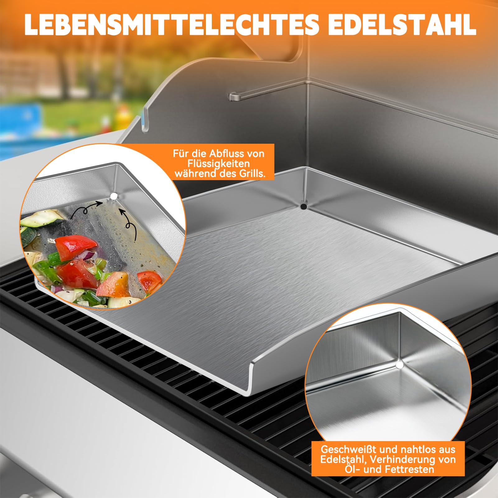 - Intelligentes Fettmanagement: Ein durchdachtes Design mit auslaufsicheren Ecken und einem doppelten Fettablauf sorgt für ein sauberes Grillerlebnis.