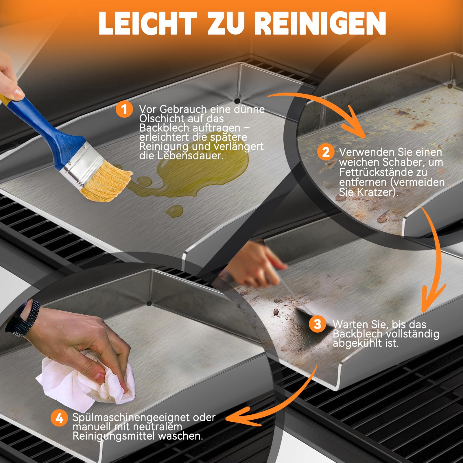 Die Reinigung ist sehr einfach. Das intelligente Design mit doppeltem Fettablauf leitet überschüssige Flüssigkeiten effizient ab. Nach dem Abkühlen kann die gesamte Platte bequem und hygienisch in der Spülmaschine gereinigt werden, was mühsames Schrubben überflüssig macht.
