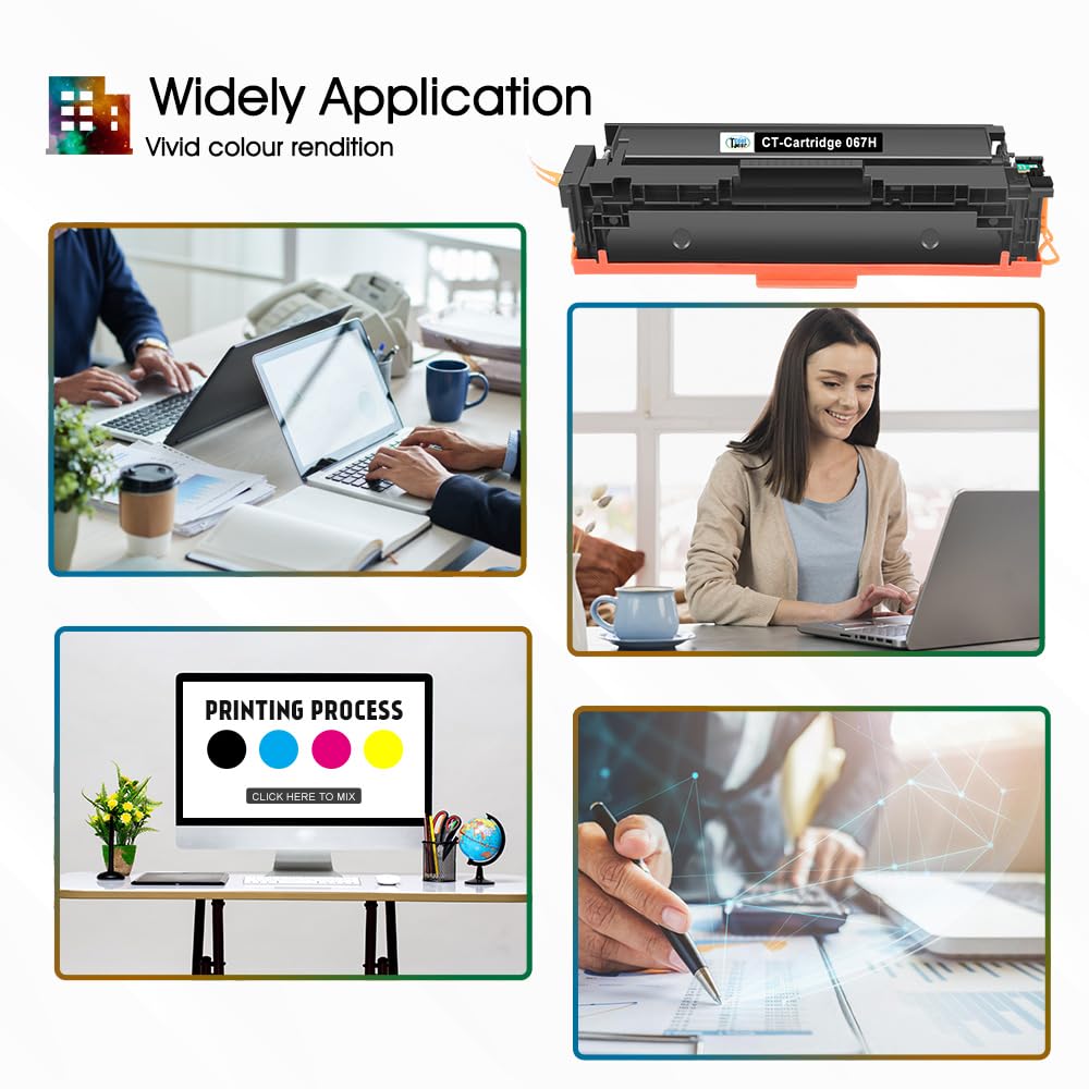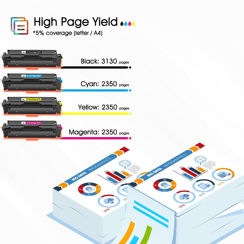 Profitieren Sie von einer kosteneffizienten Drucklösung, ohne bei der Qualität Kompromisse eingehen zu müssen. Unsere kompatiblen 067H Tonerkartuschen sind die ideale Alternative zu Originalprodukten und liefern zuverlässig scharfe Texte und lebendige Farben. Dank der hohen Seitenleistung müssen Sie die Kartuschen seltener wechseln, was Ihnen Zeit spart und die Produktivität steigert.