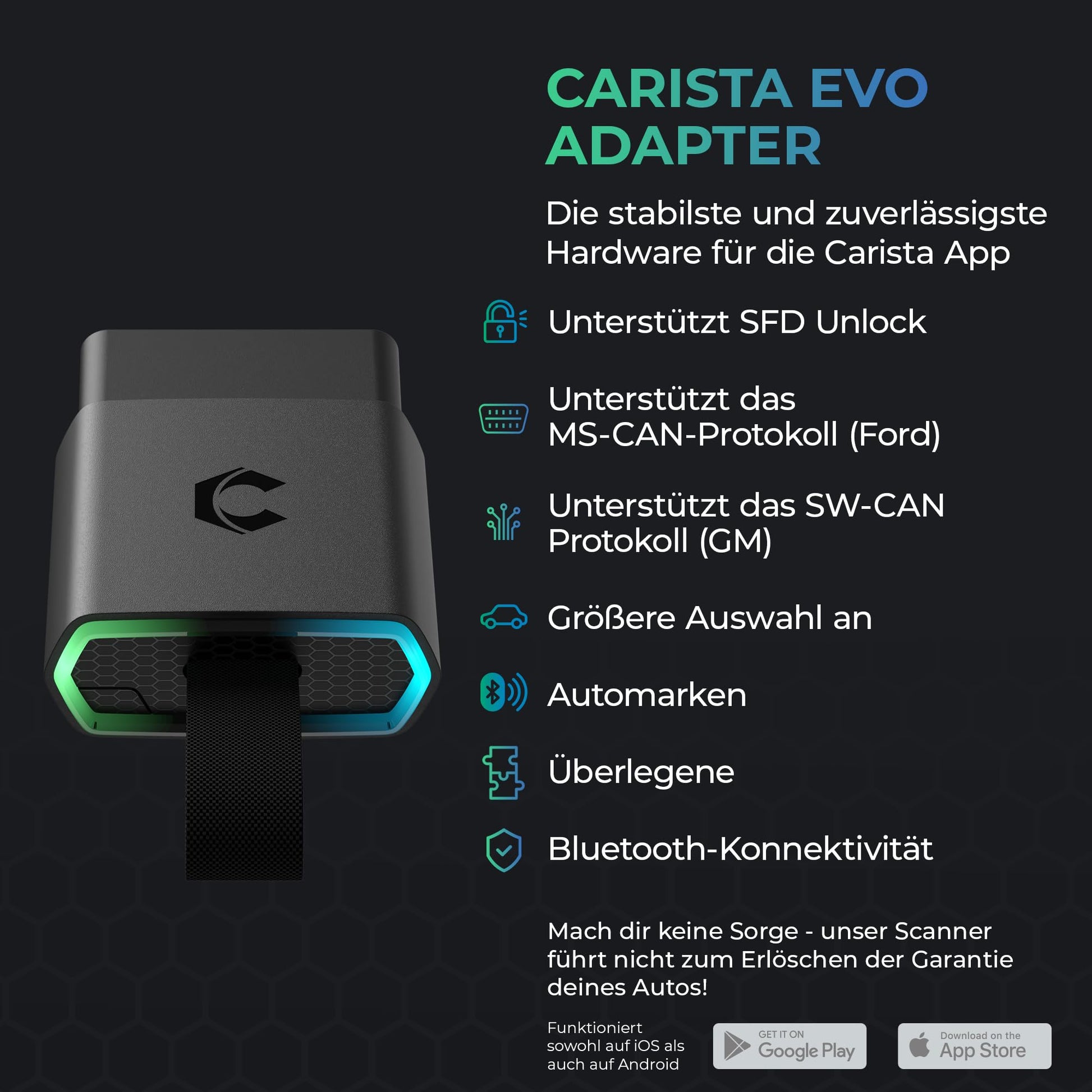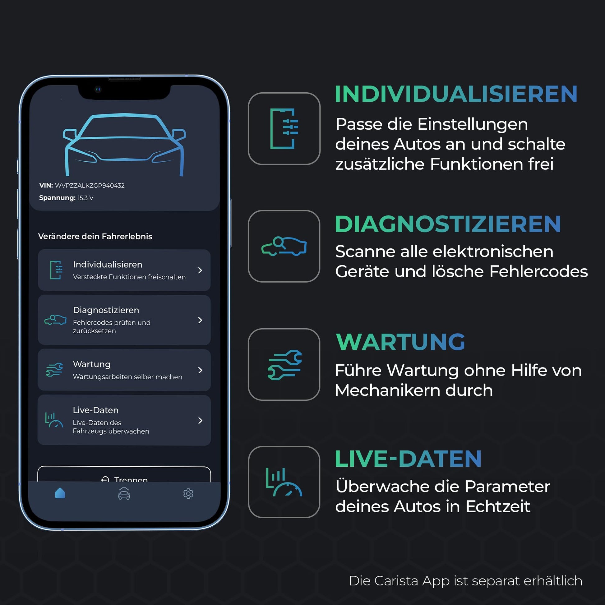 - Plattformübergreifend: Die zugehörige Carista App ist sowohl für iOS- als auch für Android-Geräte verfügbar.
