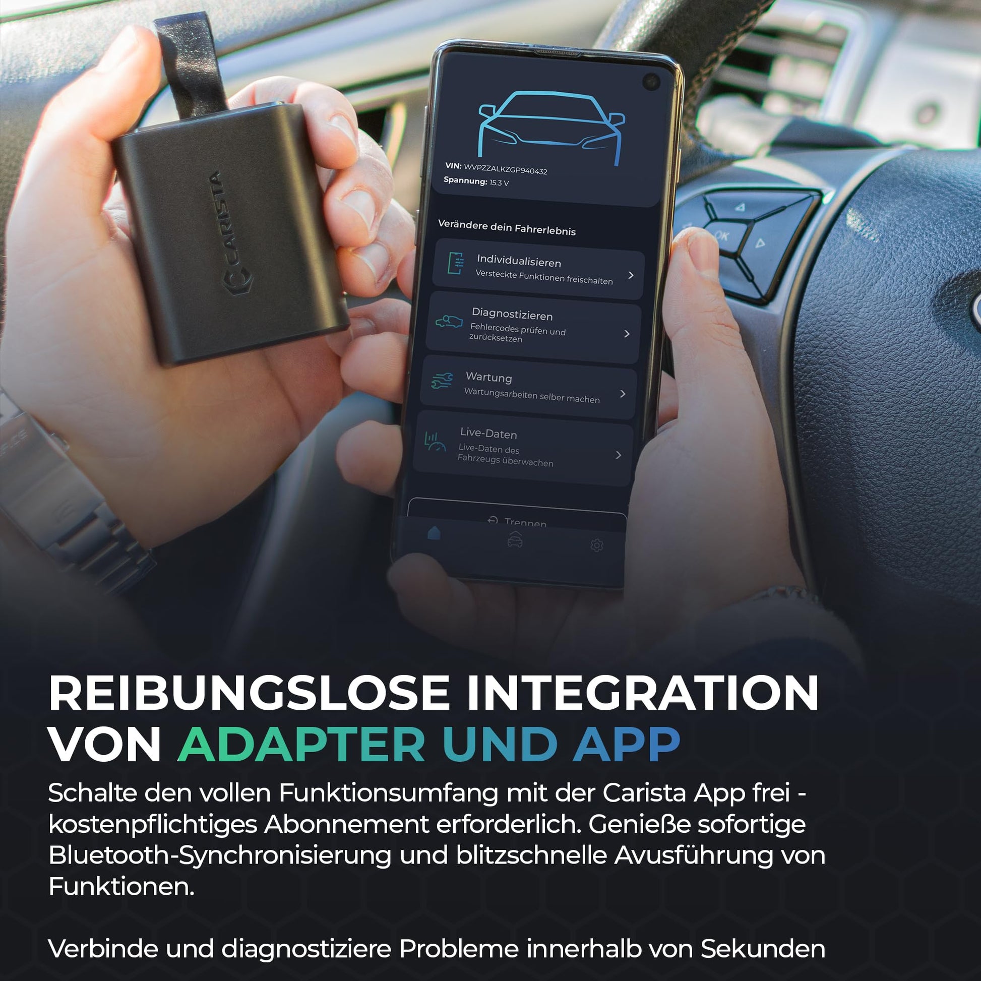- Erweiterte Funktionen via App-Abonnement: Der Adapter schaltet bei Kauf die grundlegenden OBD2-Funktionen frei. Für den Zugriff auf tiefergehende Diagnosen, Service-Werkzeuge, Live-Daten und Fahrzeug-Individualisierungen ist ein separates, kostenpflichtiges Abonnement der Carista App (1-Monats- oder 12-Monats-Option) erforderlich.