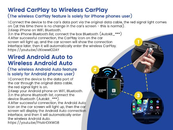 Verwandeln Sie Ihr ab Werk installiertes, kabelgebundenes Apple CarPlay und Android Auto in eine komfortable, kabellose Verbindung. Dieser 2-in-1-Adapter macht Schluss mit dem Kabelsalat im Auto und sorgt für ein nahtloses und aufgeräumtes Fahrerlebnis.