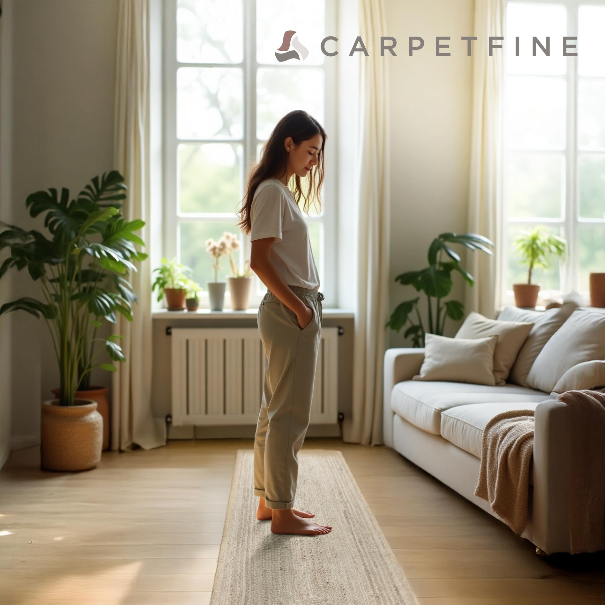 Jute hat eine feste, natürliche Struktur, die ein angenehm massierendes Gefühl unter den Füssen erzeugt. Obwohl er nicht so weich wie ein Wollteppich ist, schätzen viele das erdende und authentische Laufgefühl, das er vermittelt.