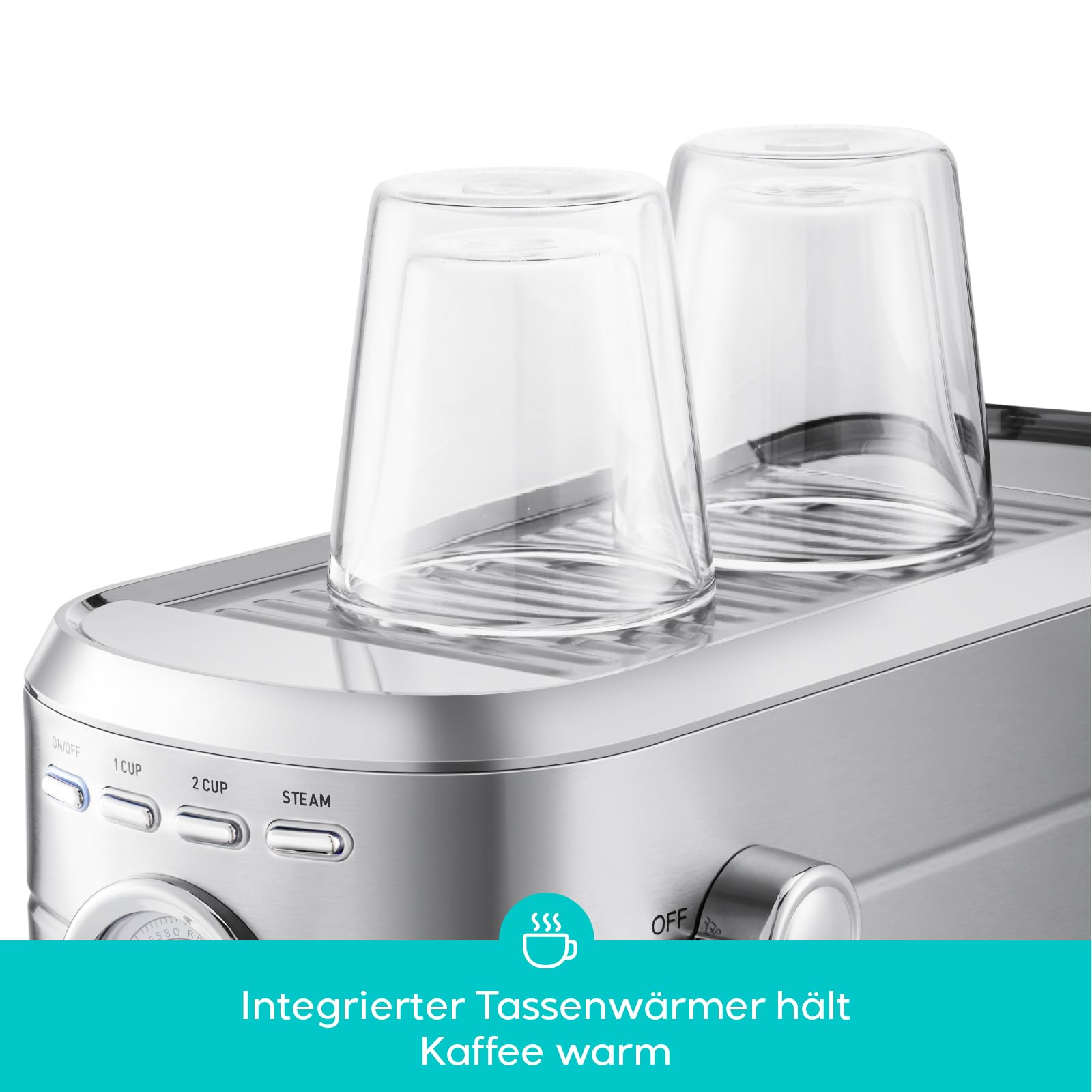 - Volle Kontrolle: Das integrierte Manometer gibt Ihnen jederzeit klare Auskunft über den Brühdruck, damit jeder Kaffee zuverlässig gelingt.