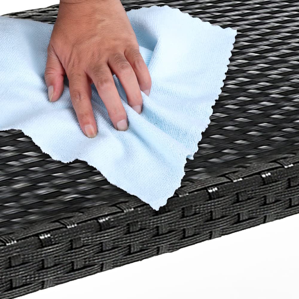 Die Pflege ist denkbar einfach. Das Polyrattan-Geflecht benötigt keine spezielle Behandlung und kann bei Verschmutzung einfach mit einem feuchten Tuch und milder Seifenlauge gereinigt werden, was es deutlich pflegeleichter als echtes Rattan macht.