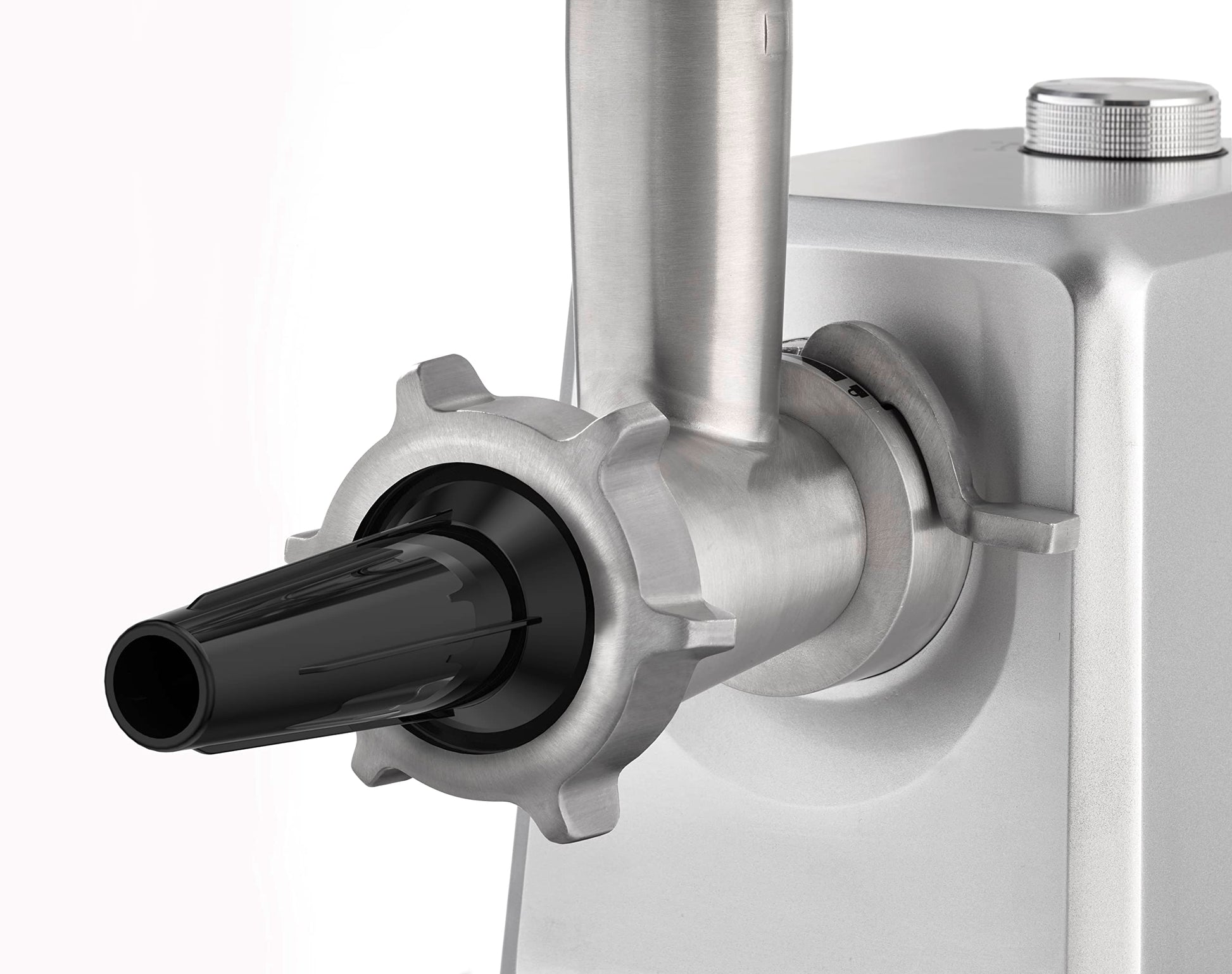 - Zubehör: Burgerpresse, 3 Lochscheiben, Wurstfüller, Spritzgebäck-Aufsatz (4 Formen), Stopfer