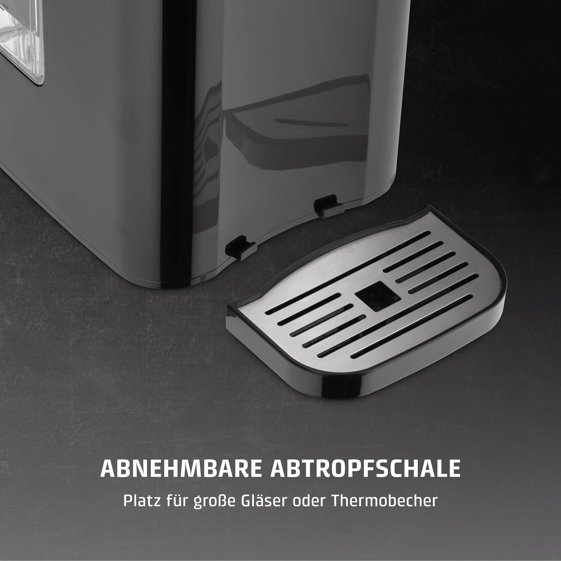 Der Wassertank hat ein grosszügiges Fassungsvermögen von 2,9 Litern und ist zum leichten Befüllen abnehmbar. Ja, durch die herausnehmbare Tropfschale finden auch grosse Tassen und Gläser mit einer Höhe von bis zu 17 cm problemlos Platz.