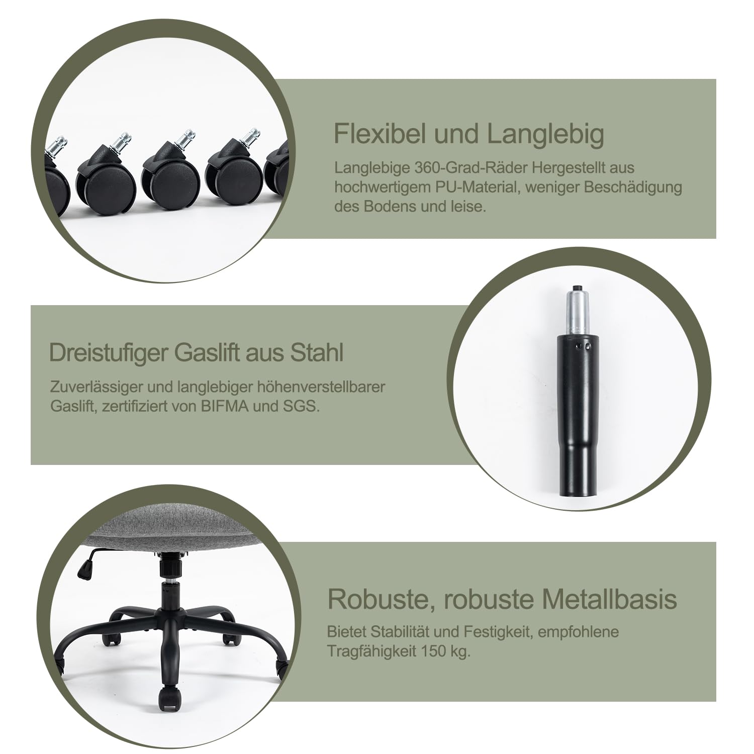 - Hohe Stabilität: Ein robustes Fünf-Stern-Fusskreuz aus Stahl, eine SGS-zertifizierte Gasdruckfeder und leichtlaufende 360-Grad-PU-Rollen garantieren Sicherheit und Langlebigkeit.