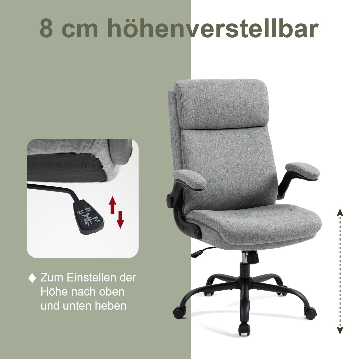 - Flexible Anpassung: Der Stuhl bietet eine Sitzhöhenverstellung um 8 cm, eine sanfte Wippfunktion bis 110° und um 90° hochklappbare Armlehnen.