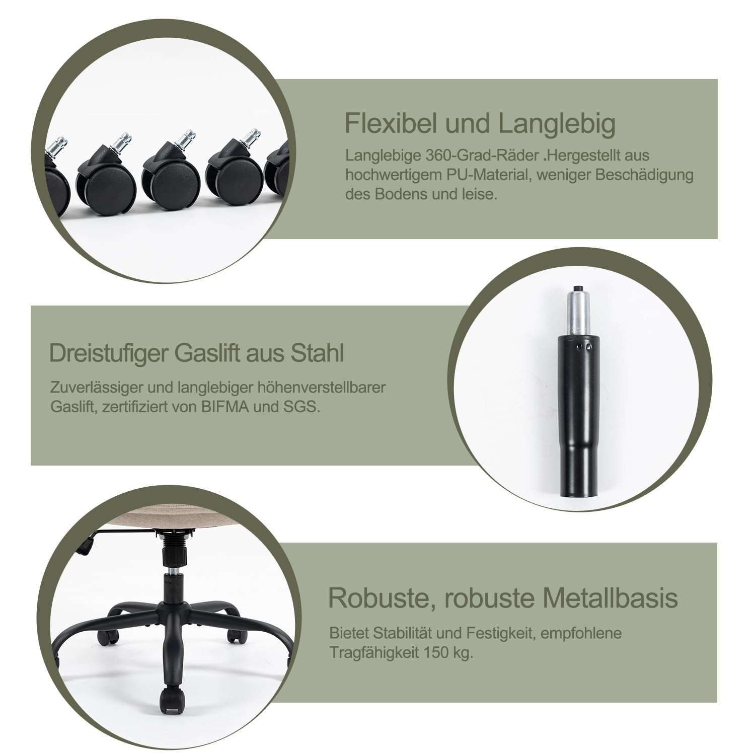 - Stabiles Fusskreuz: Ein robustes 5-Sterne-Fusskreuz aus Stahl sorgt zusammen mit den 360-Grad-PU-Rollen für einen sicheren Stand und leise Mobilität.