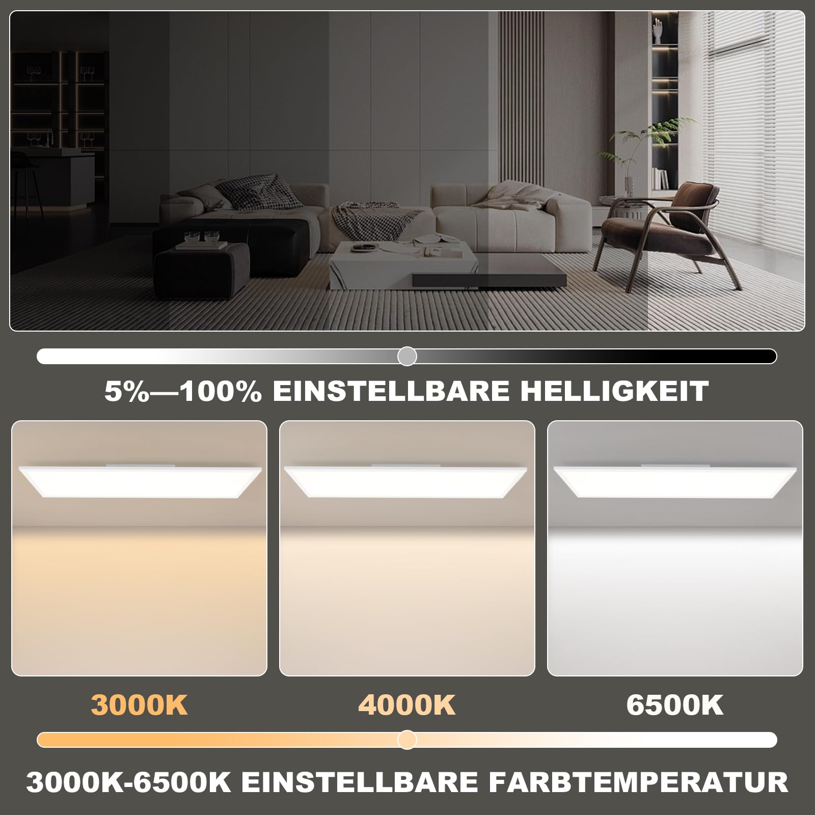Das Panel ist extrem vielseitig. Nutzen Sie kaltweisses, helles Licht (bis 6500K) für eine konzentrierte Arbeitsatmosphäre im Büro oder in der Küche. Schaffen Sie mit warmweissem, gedimmtem Licht (ab 3000K) eine gemütliche Stimmung im Wohn- oder Esszimmer. Die RGB-Farbwechselfunktion ist ideal für dynamische Akzente im Spielzimmer.