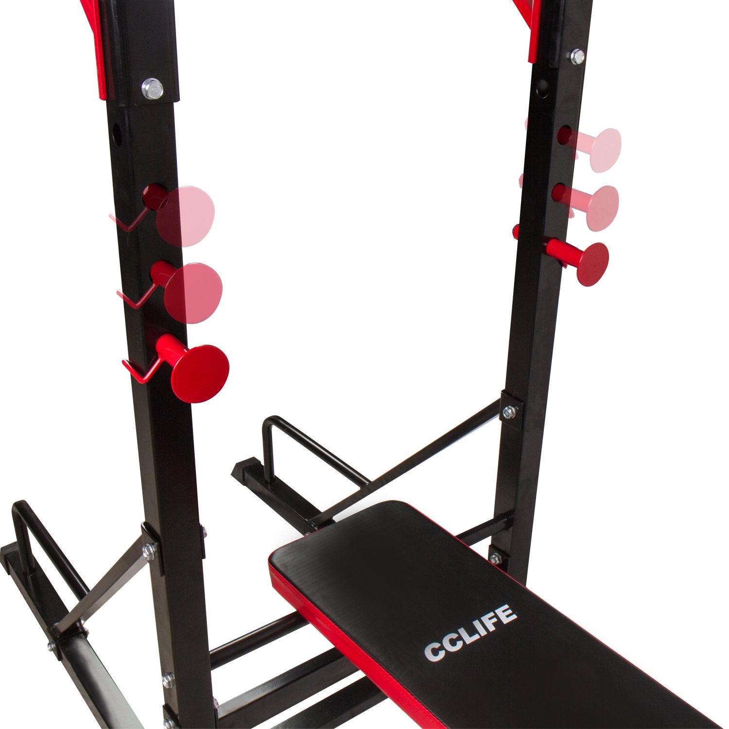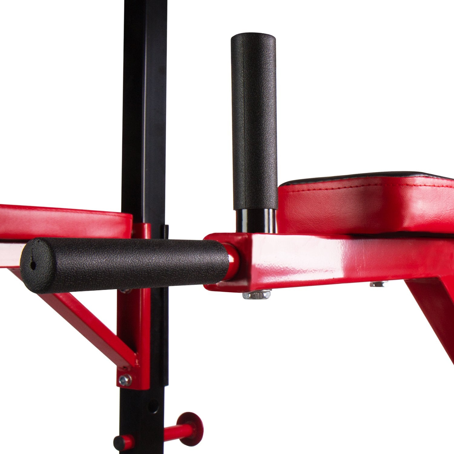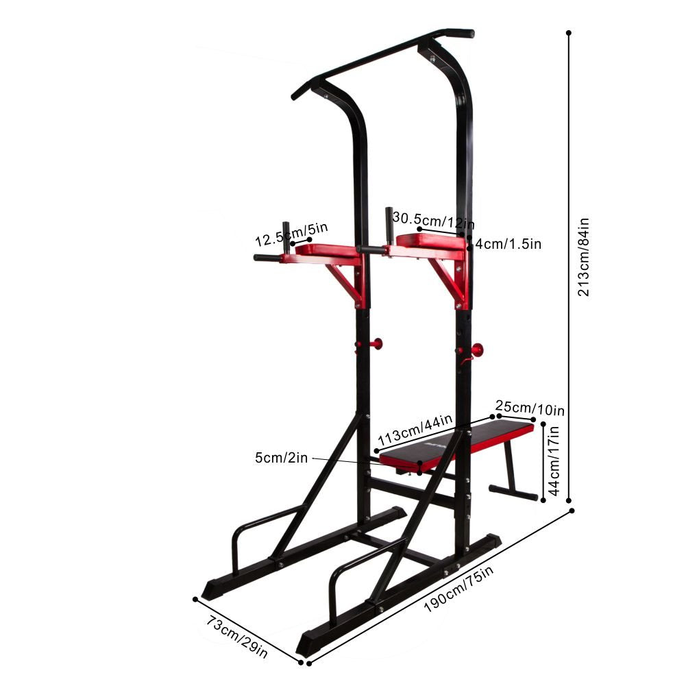 Die robuste Konstruktion aus pulverbeschichtetem Stahl ist auf intensive Workouts ausgelegt und sehr stabil. Die maximale Belastbarkeit beträgt: Klimmzugstange 110 kg, Dip-Station 110 kg, Hantelablage 80 kg und die Sitzbank bis zu 200 kg.