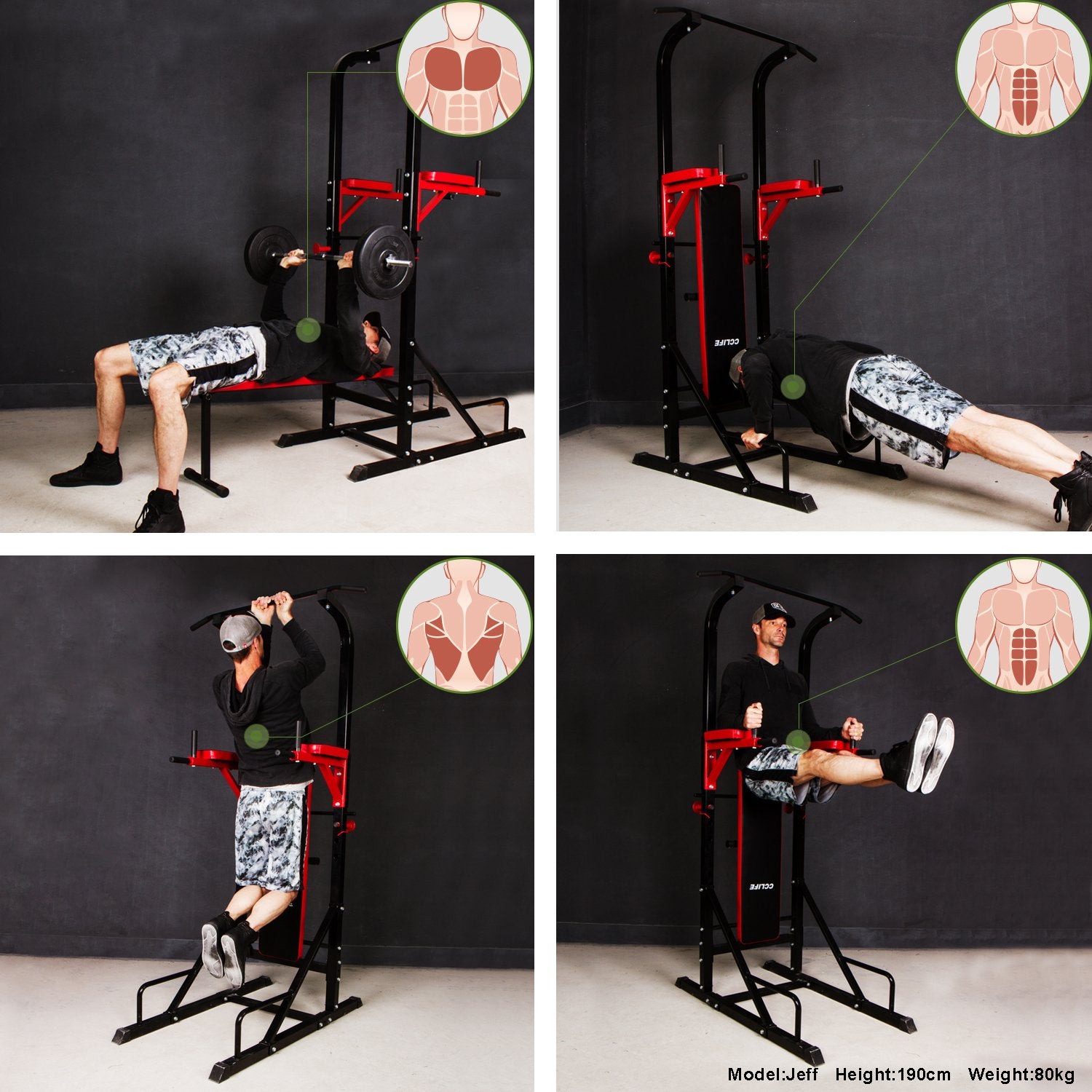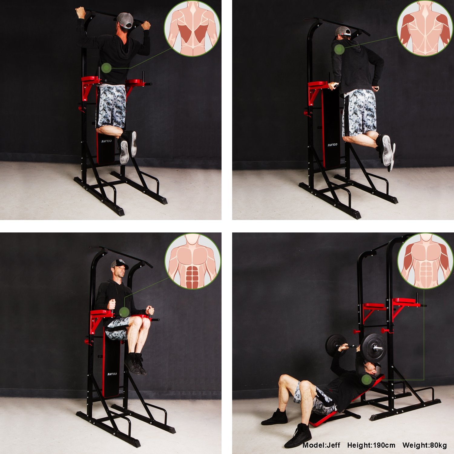 Diese multifunktionale Station ermöglicht ein komplettes Oberkörpertraining. Sie ist perfekt für Klimmzüge, Dips, Liegestütze und Beinheben sowie für gezieltes Training von Rücken, Brust, Bauch, Schultern, Bizeps und Trizeps. Die integrierte Hantelbank eignet sich zudem ideal für das Bankdrücken.
