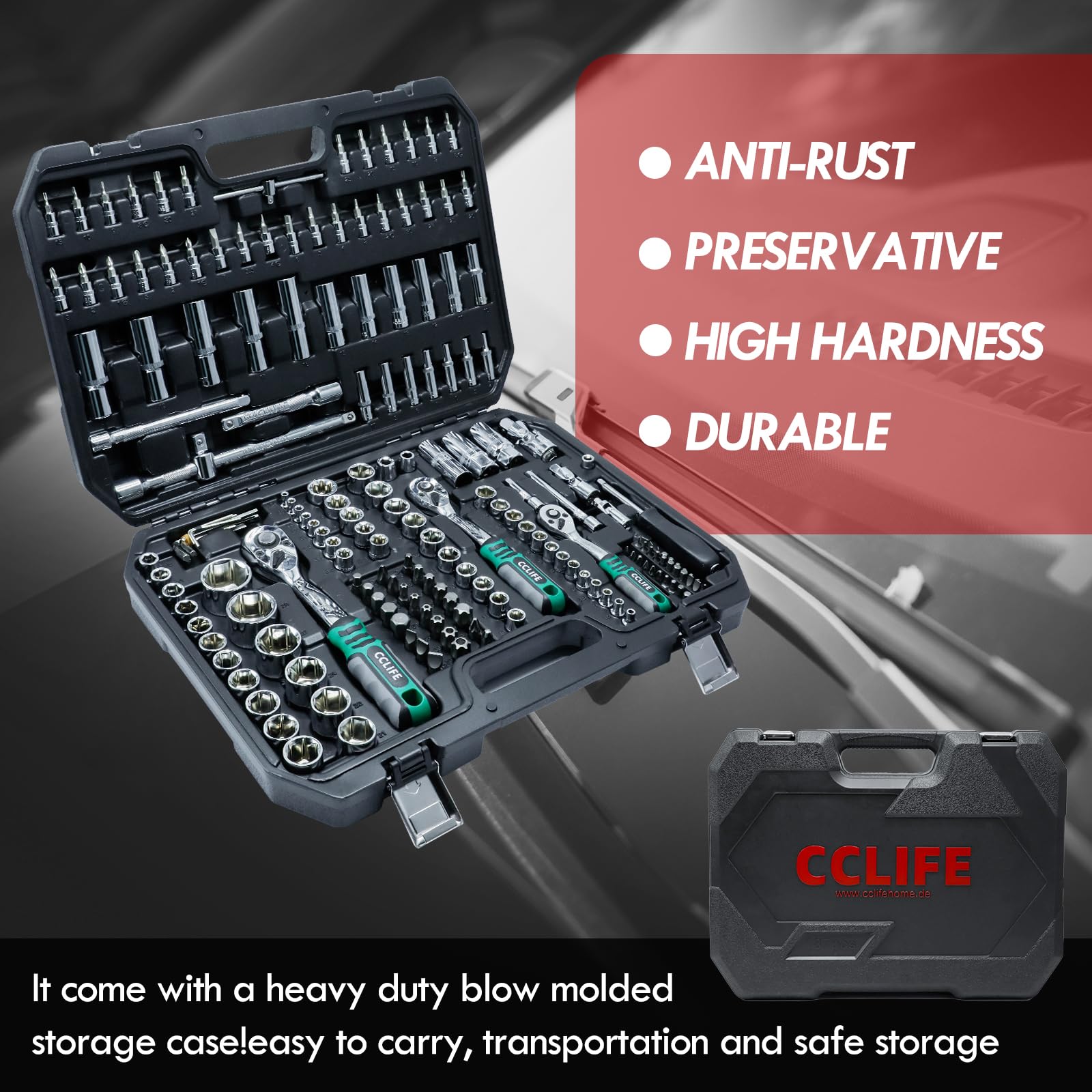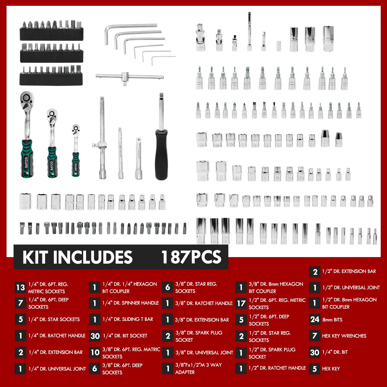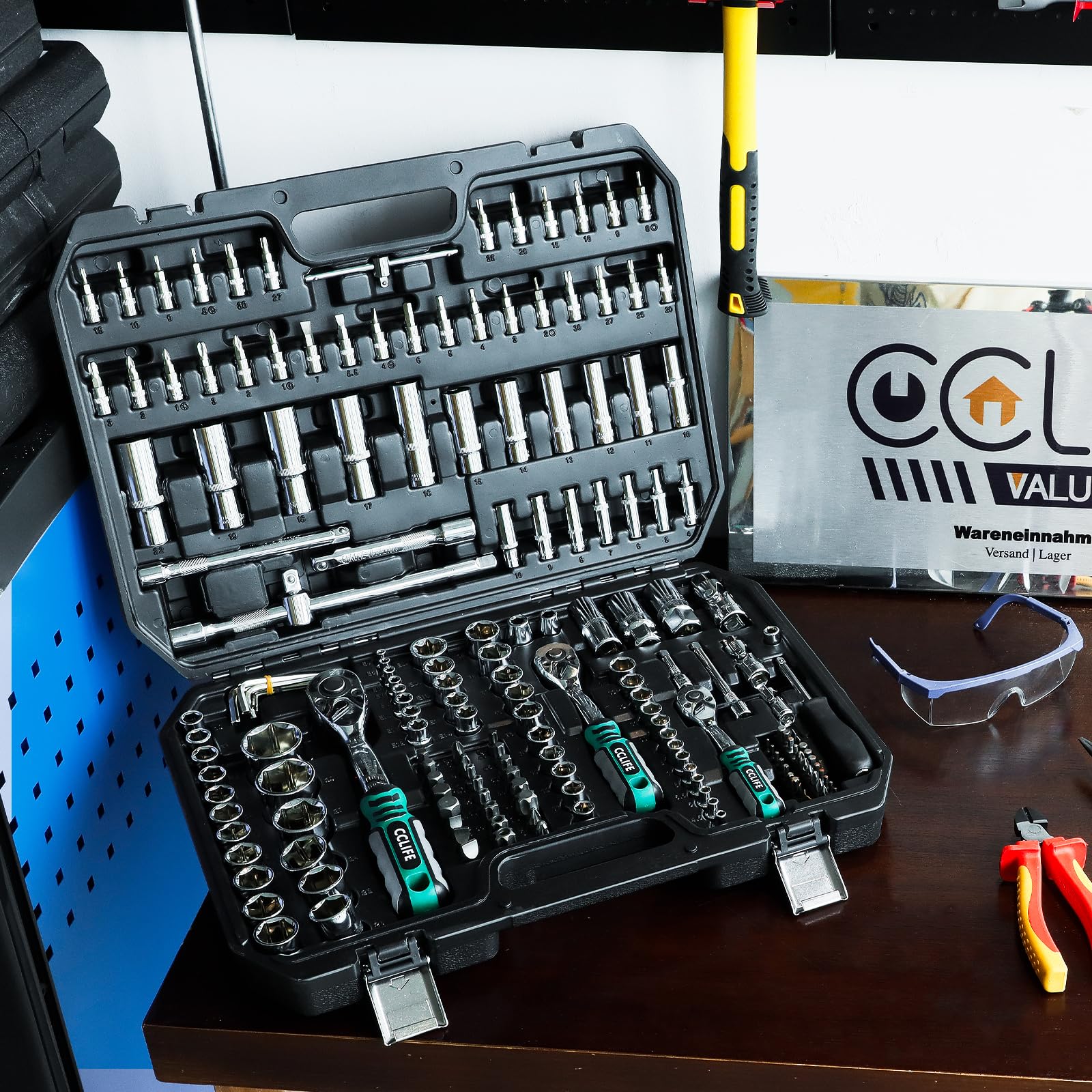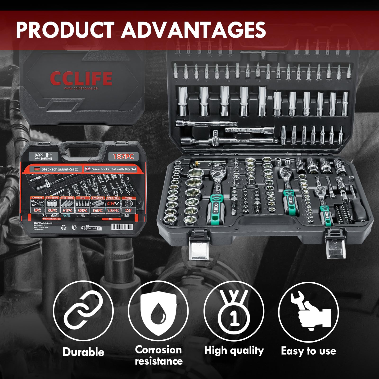 CCLIFE Steckschlüsselsatz 187-tlg. Cr-V Ratschenkoffer 72 Z. 1/2" 1/4" 3/8"