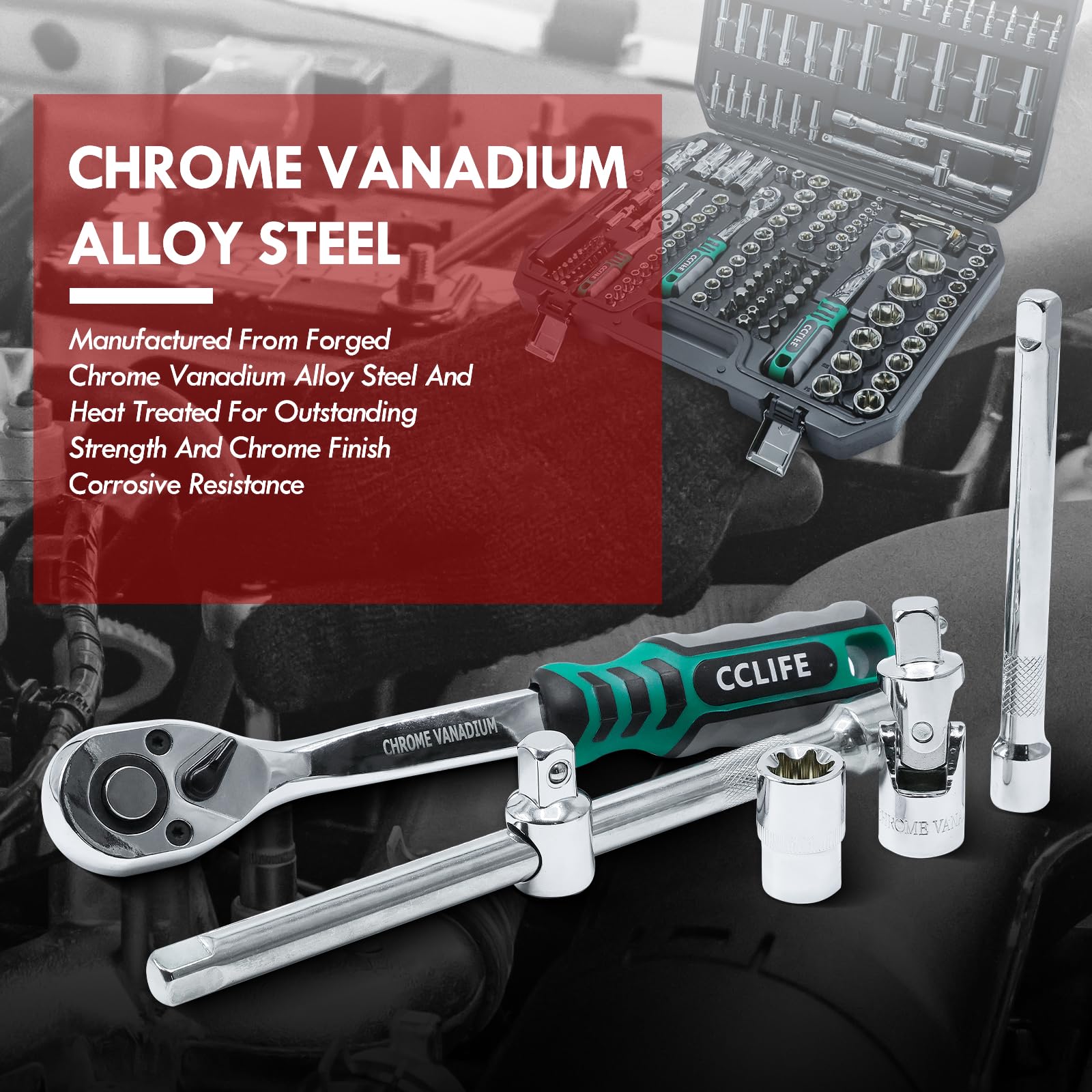 - Hochwertiges Material: Das gesamte Set besteht aus robustem Chrom-Vanadium-Stahl, was eine aussergewöhnliche Widerstandsfähigkeit gegenüber Verschleiss und eine lange Lebensdauer garantiert.