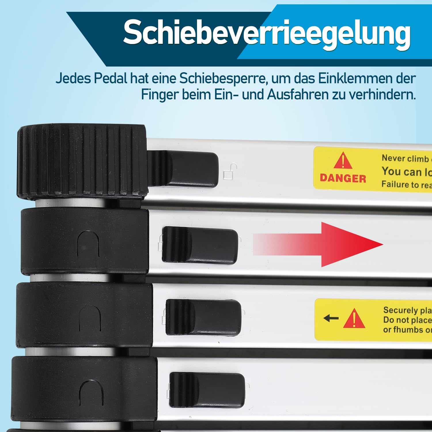 Die Handhabung dieser Leiter ist denkbar einfach und sicher. Dank des cleveren Mechanismus rastet der Sicherungsstift bei jeder Stufe automatisch ein. Für eine flexible Anpassung an die gewünschte Arbeitshöhe müssen Sie lediglich die seitlichen Knöpfe an der jeweiligen Sprosse drücken und die Leiter auf die benötigte Länge ausziehen oder einschieben.