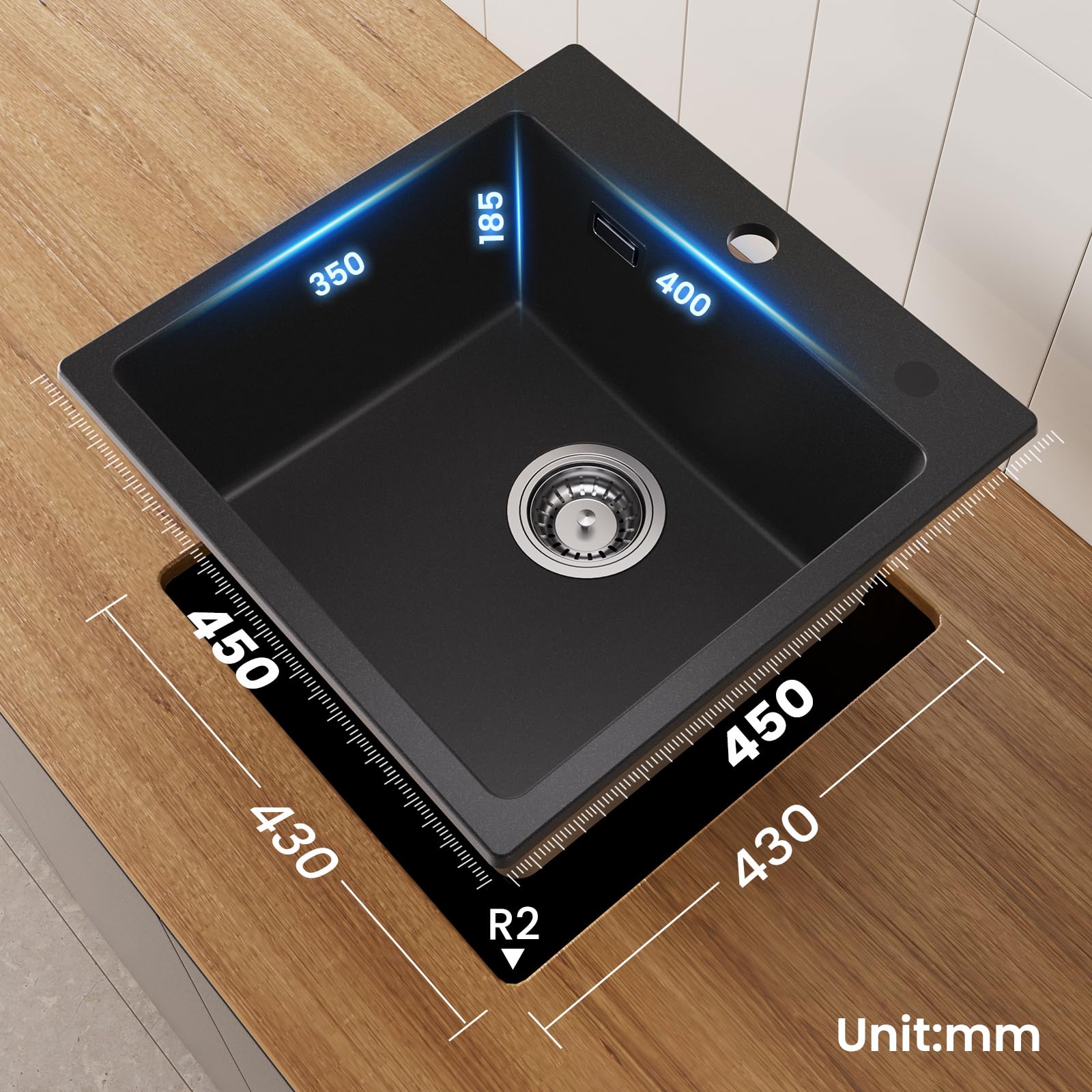 CECIPA Granit-Einbauspüle 45x45cm, schwarz eckig, 2 Hahnlöcher