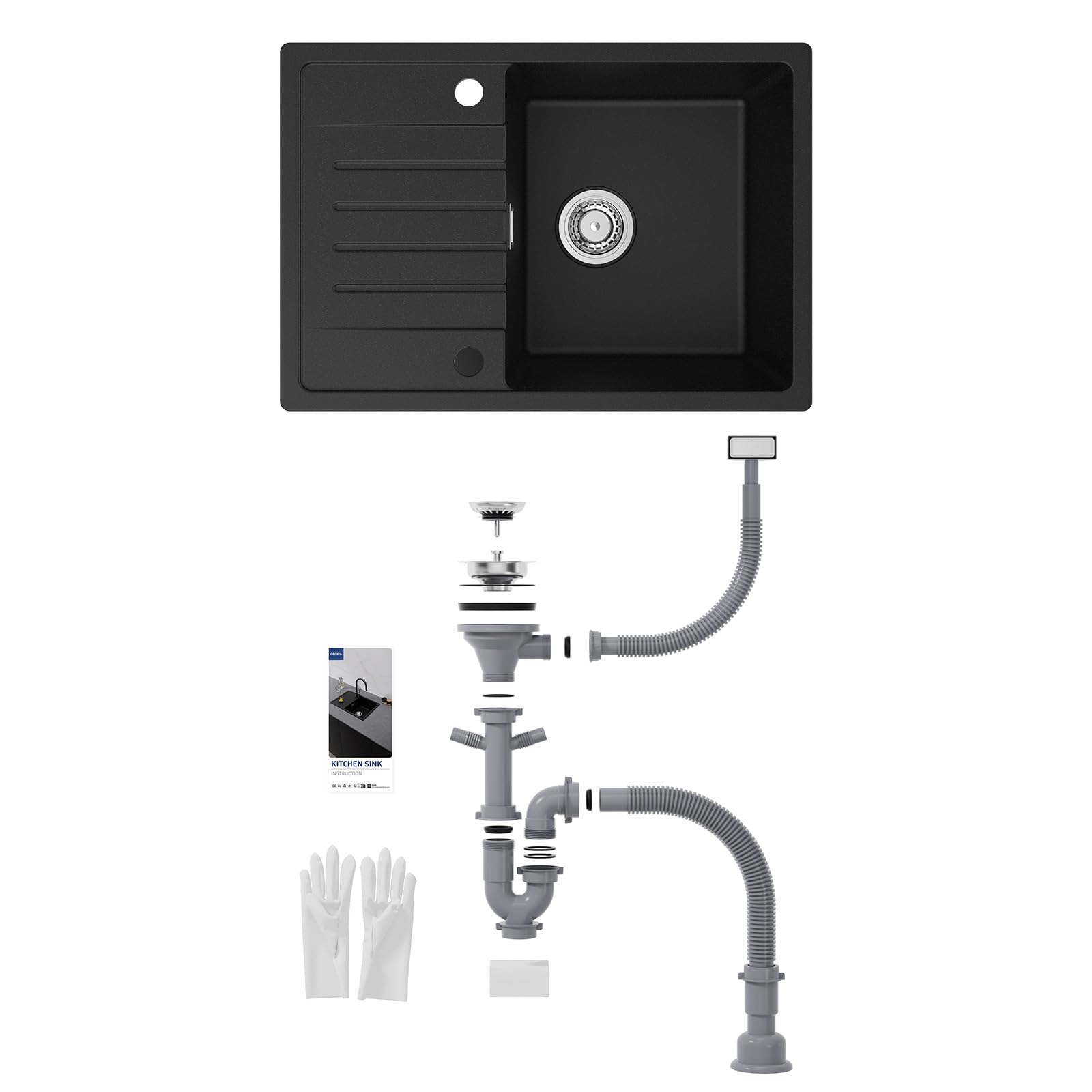 - Lieferumfang: Inklusive Spülbecken, kompletter Ab- und Überlaufgarnitur, Siphon, Schneideschablone und Montagezubehör.