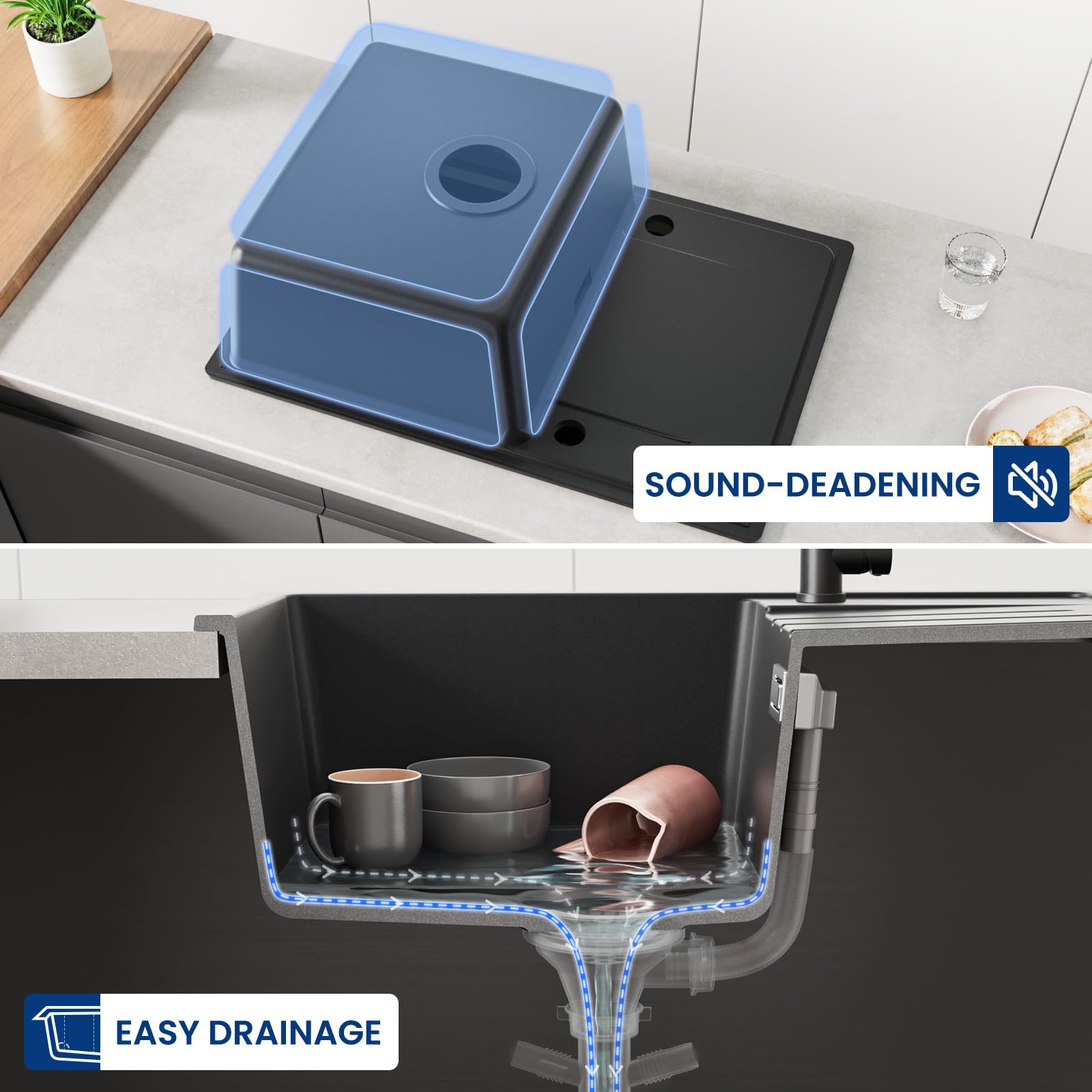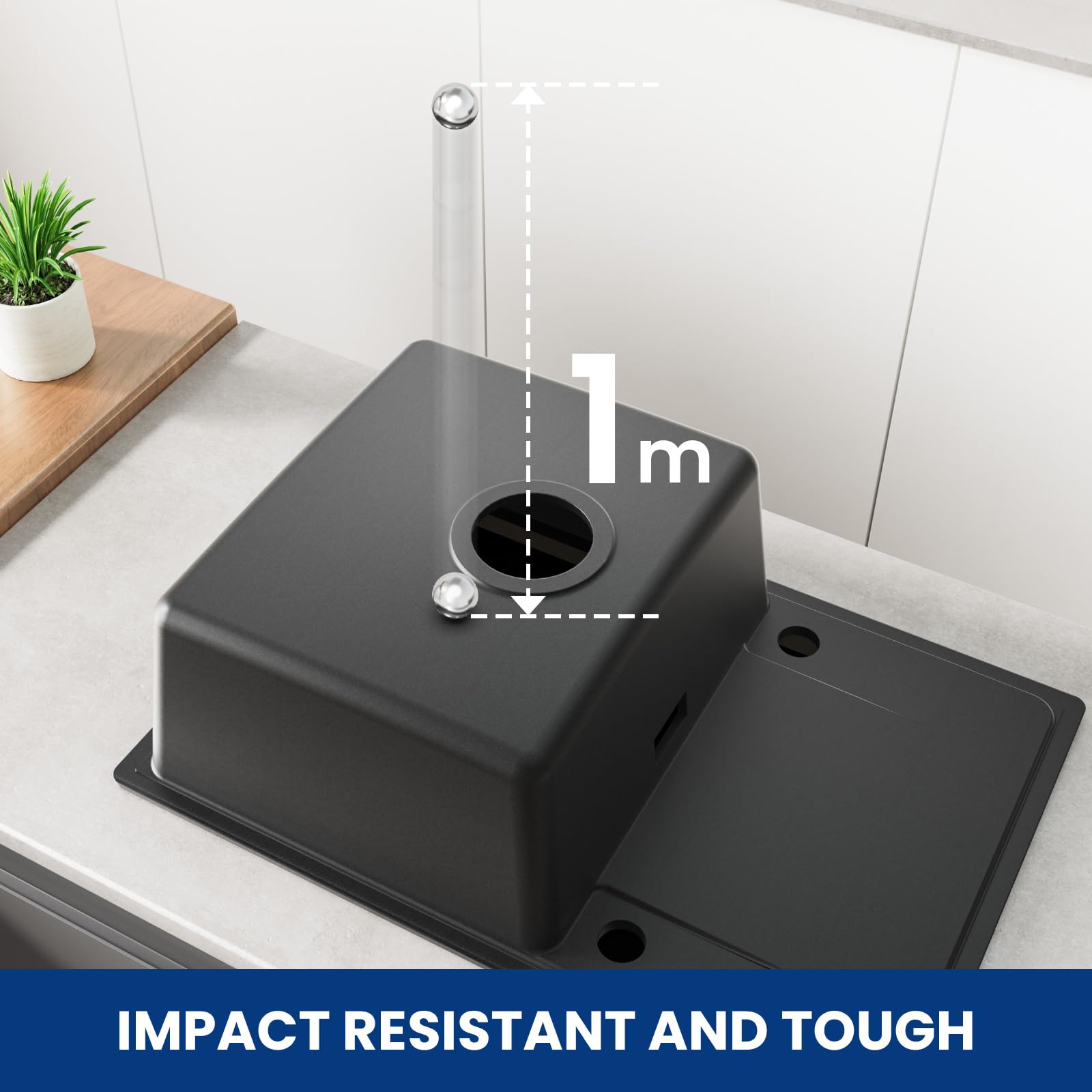 Dank der äusserst dichten und porenfreien Oberfläche können Flecken und Schmutz kaum anhaften, was die Reinigung spürbar erleichtert. Die hohe Materialstärke von bis zu 12 mm sorgt nicht nur für eine überragende Stabilität, sondern reduziert auch die Geräusche des Wasserflusses – für eine ruhigere und angenehmere Atmosphäre in Ihrer Küche.