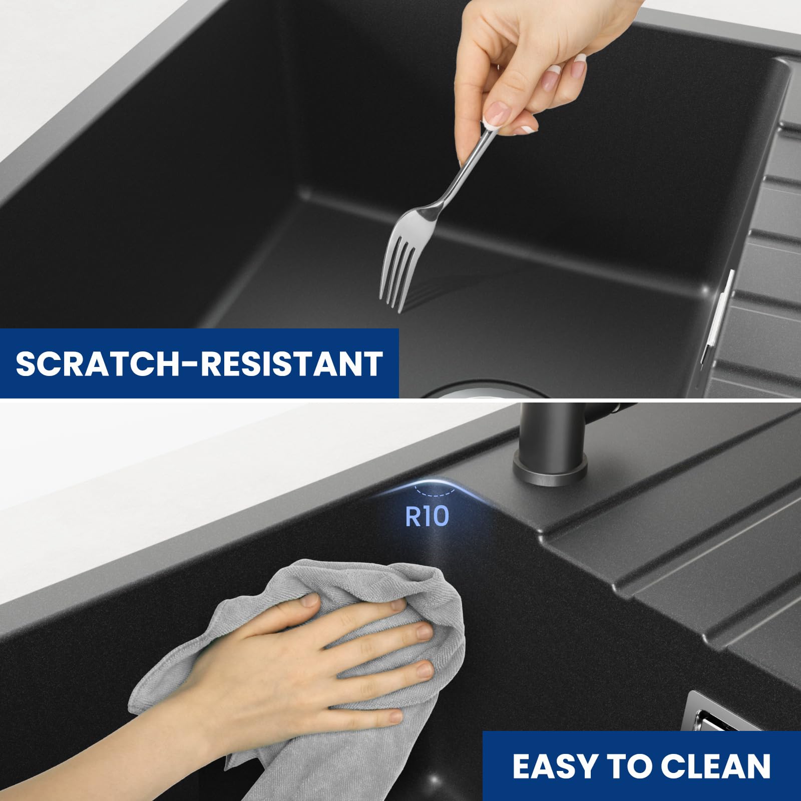 Die Spüle besteht aus einem hochwertigen Verbundstoff aus 80 % Quarzsand und 20 % Harz. Diese Materialmischung macht die Oberfläche extrem widerstandsfähig, abriebfest und unempfindlich gegenüber den Kratzern des täglichen Gebrauchs.