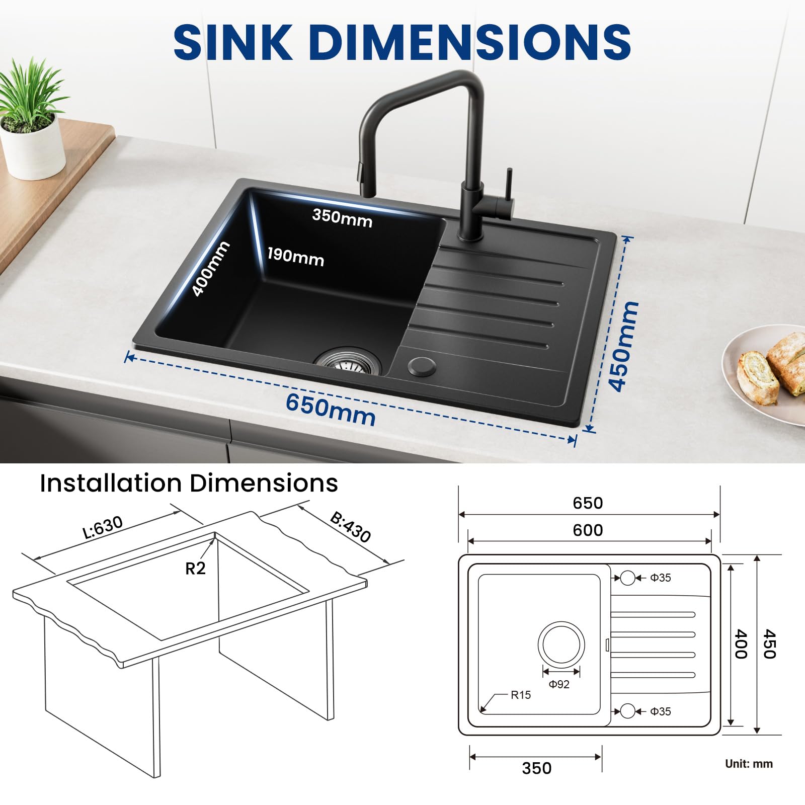 - Design: Elegante schwarze Optik, passend für alle gängigen Arbeitsplatten.
