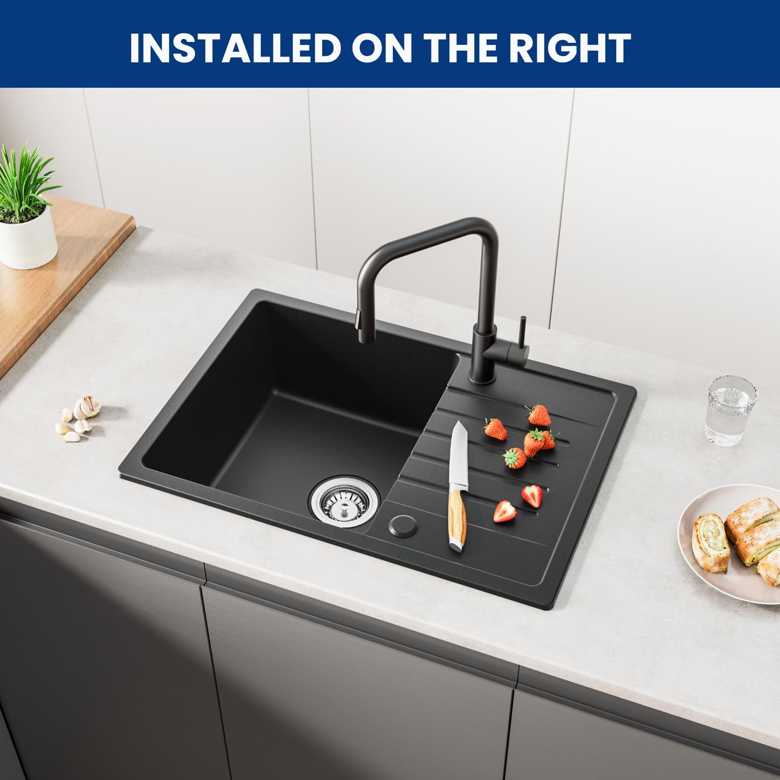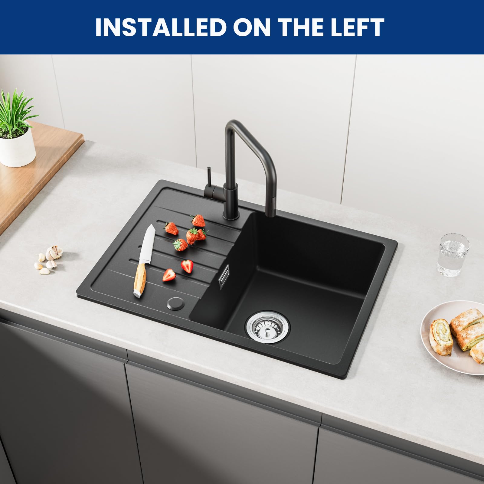 Ja, die Spüle ist reversibel konzipiert. Sie können bei der Montage flexibel entscheiden, ob sich das Hauptbecken auf der linken oder rechten Seite befinden soll, um es perfekt an Ihre Küchenanordnung anzupassen.
