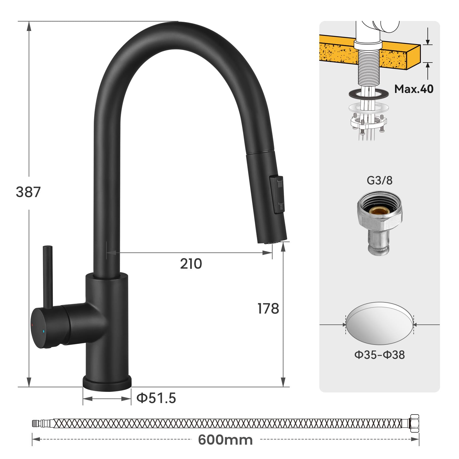 - Einfache Montage: Konzipiert für eine unkomplizierte Installation in Standard-Hahnlöchern (35-38 mm) bei Arbeitsplatten mit bis zu 40 mm Stärke.