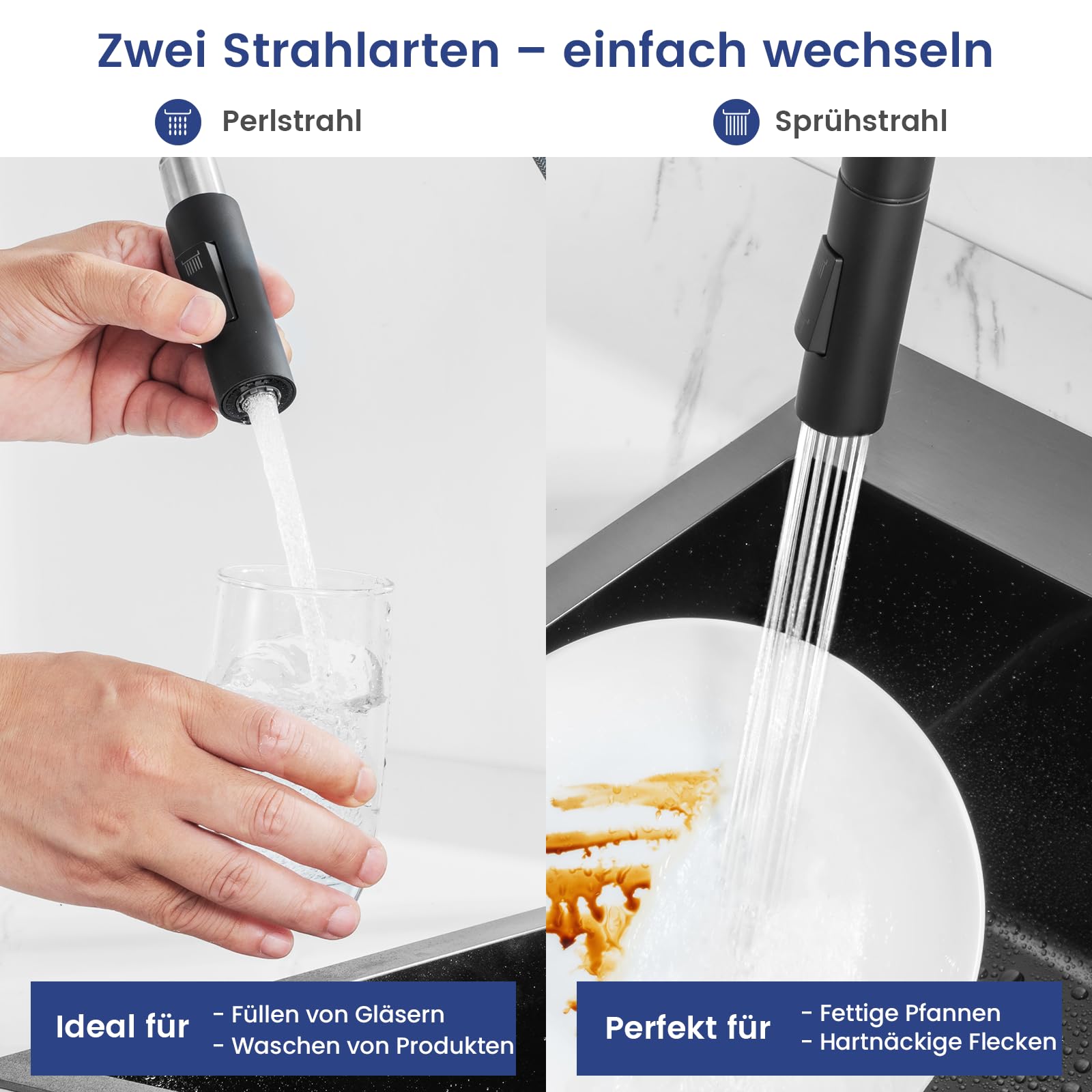 - Zwei Strahlarten: Wechseln Sie per Knopfdruck bequem zwischen einem sanften, wassersparenden Normalstrahl und einem kräftigen Brausestrahl zum Abspülen.