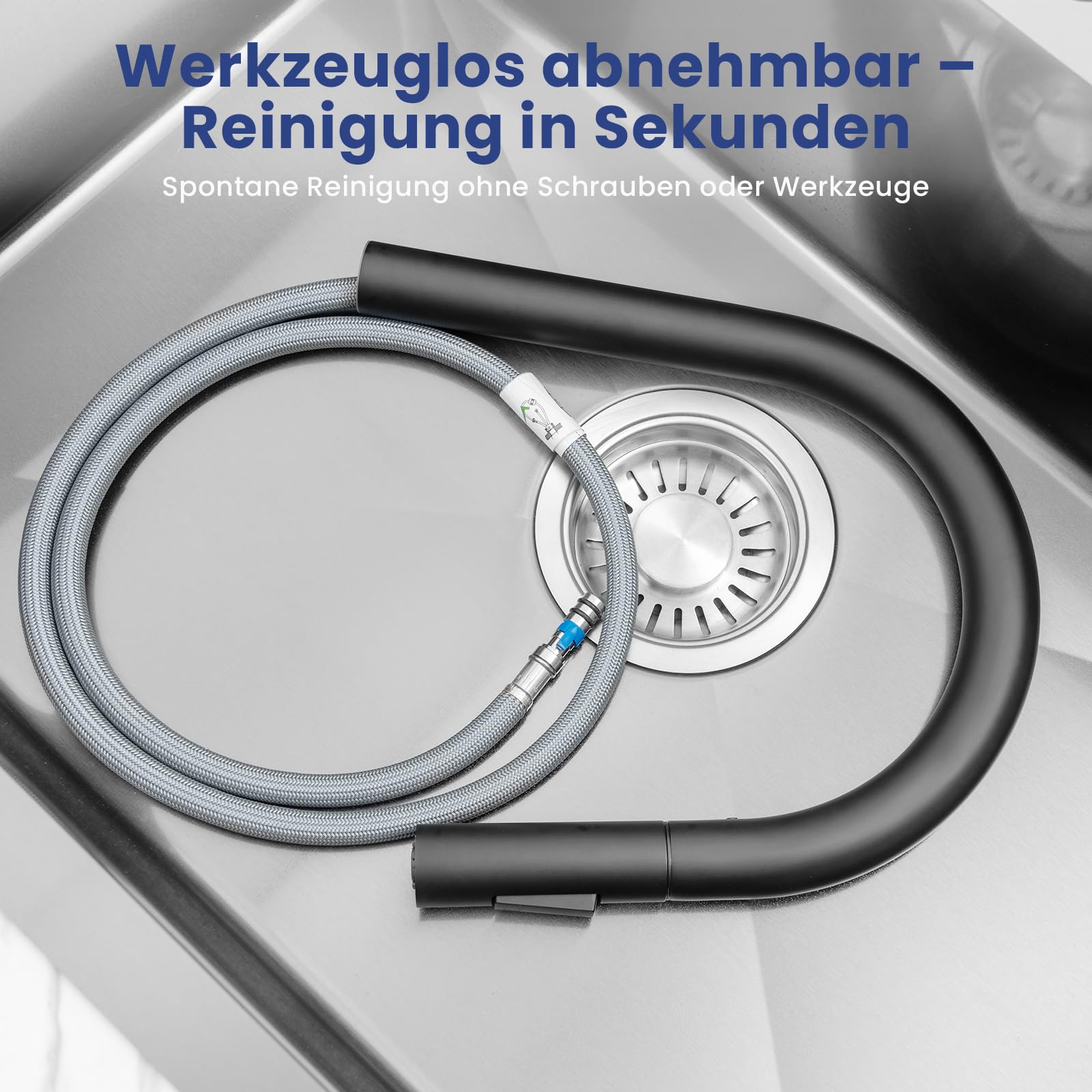 Der ausziehbare Brauseschlauch und der hohe, schwenkbare Hahn machen die Arbeit in der Küche spürbar einfacher. Füllen Sie mühelos grosse Töpfe oder reinigen Sie jede Ecke Ihres Spülbeckens gründlich und ohne Einschränkungen. Nach der Benutzung zieht sich der Brausekopf dank des Gegengewichts automatisch und sauber in seine Ausgangsposition zurück.
