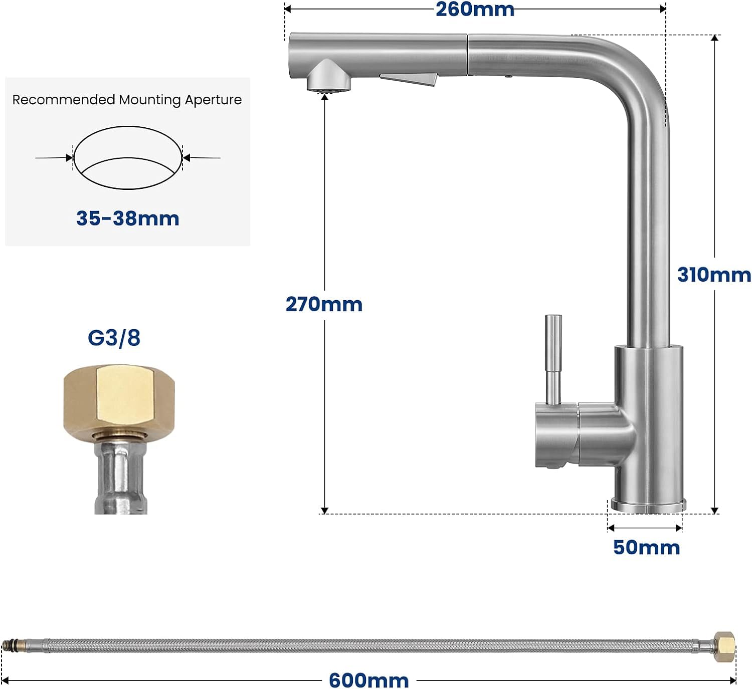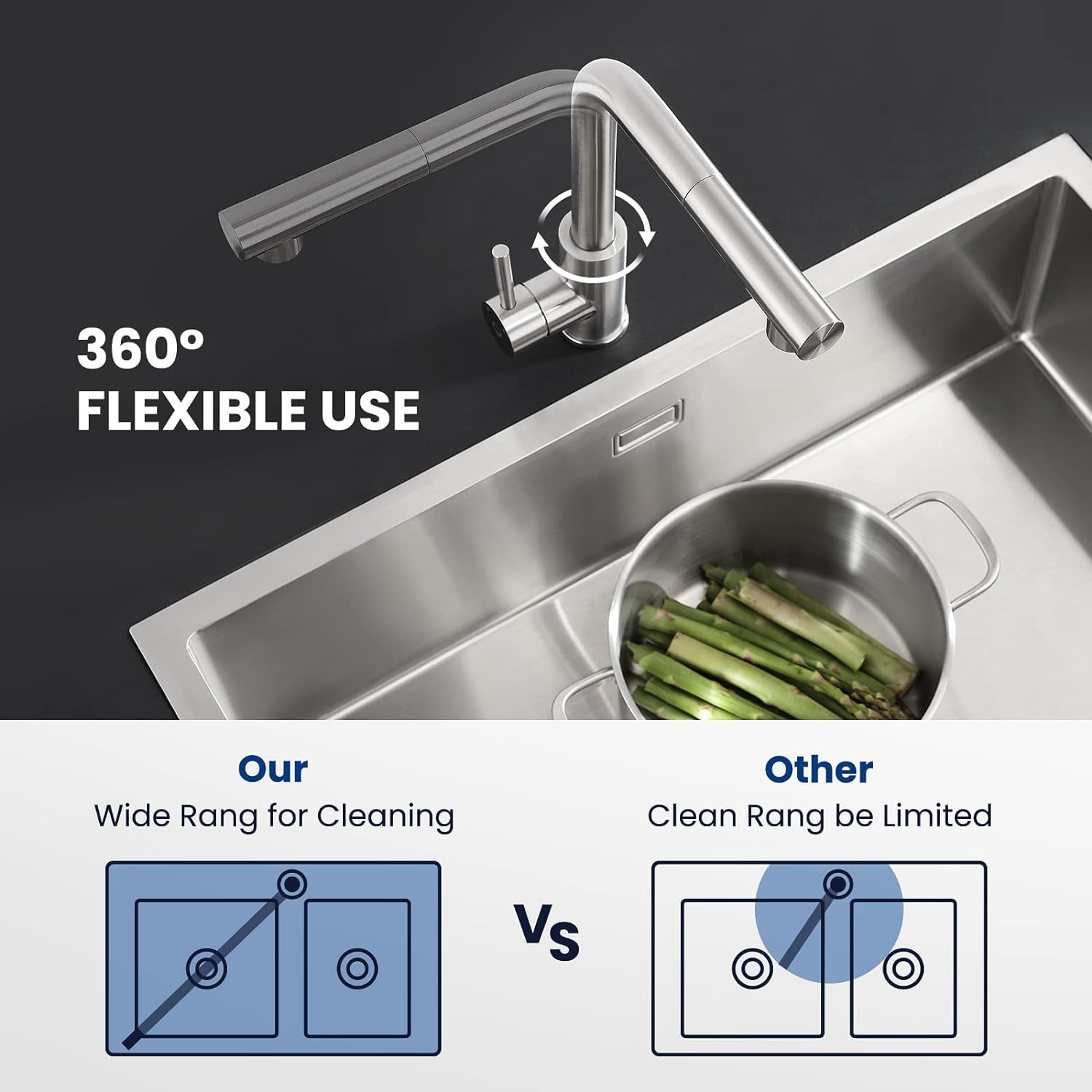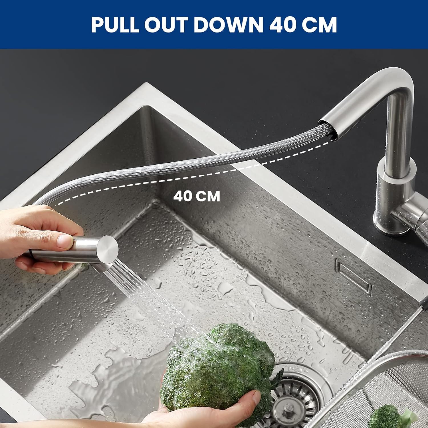 - Hohe Flexibilität: Der Brausekopf ist bis zu 40 cm ausziehbar und der gesamte Wasserhahn um 360° schwenkbar.