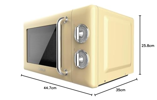 Verleihen Sie Ihrer Küche einen Hauch von Nostalgie mit dieser mechanischen Mikrowelle im charmanten Retro-Look. Sie verbindet eine stilvolle Vintage-Ästhetik mit allen wichtigen Funktionen für den täglichen Gebrauch.