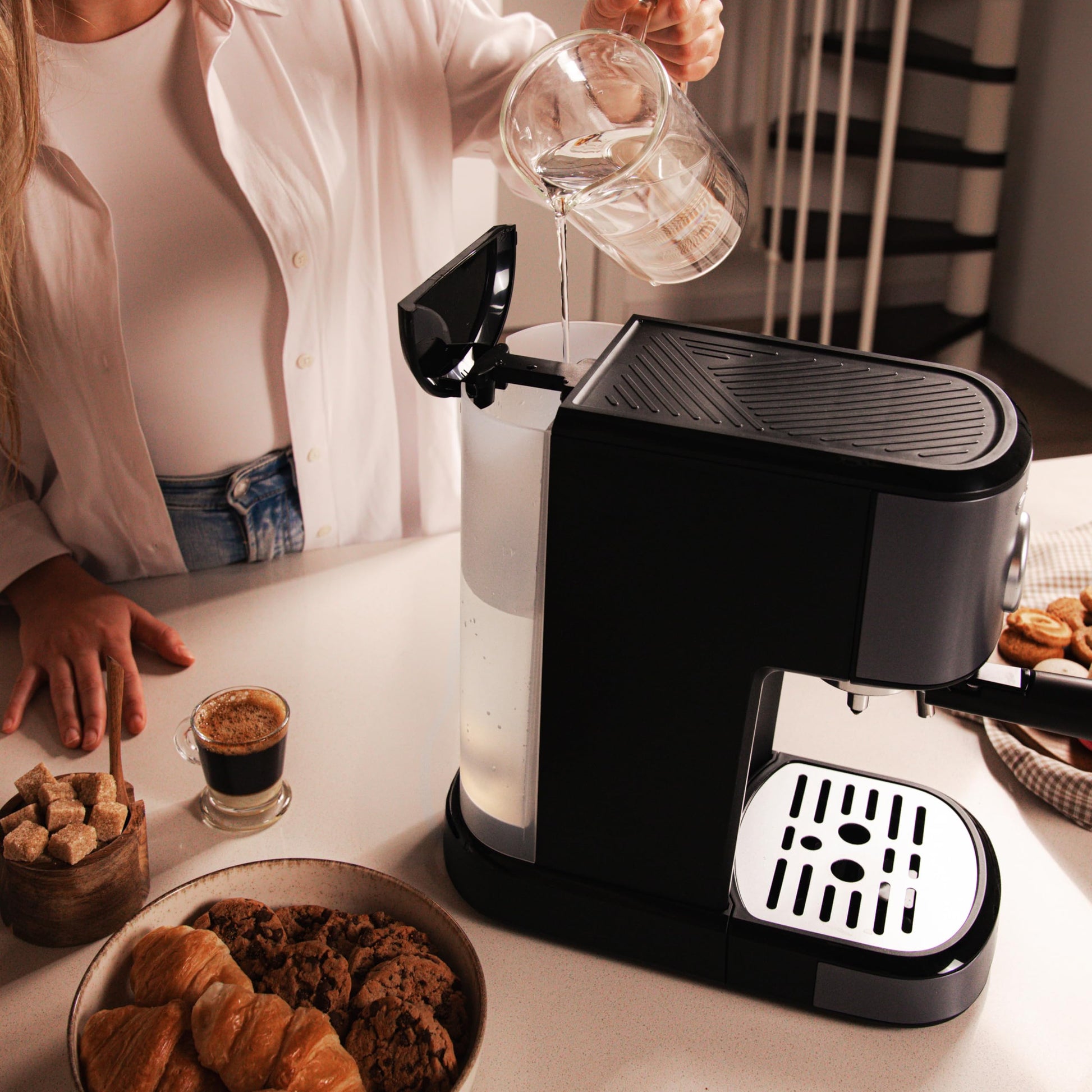 - Durchdachtes Design: Ein abnehmbarer 1.25-Liter-Wassertank und ein Tassenwärmer aus Edelstahl runden die Ausstattung ab.