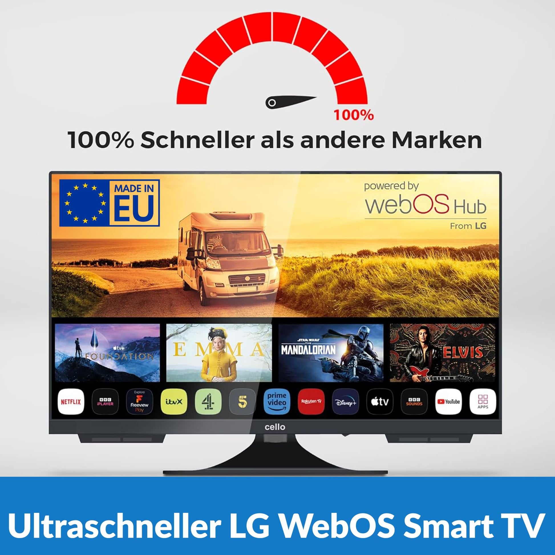 Entdecken Sie den idealen Reisebegleiter: Dieser smarte Fernseher von Cello, entwickelt in Kooperation mit LG, kombiniert ein kompaktes, rahmenloses Design mit der leistungsstarken WebOS-Plattform für erstklassige Unterhaltung in Ihrem Wohnmobil, Lastwagen oder Boot.