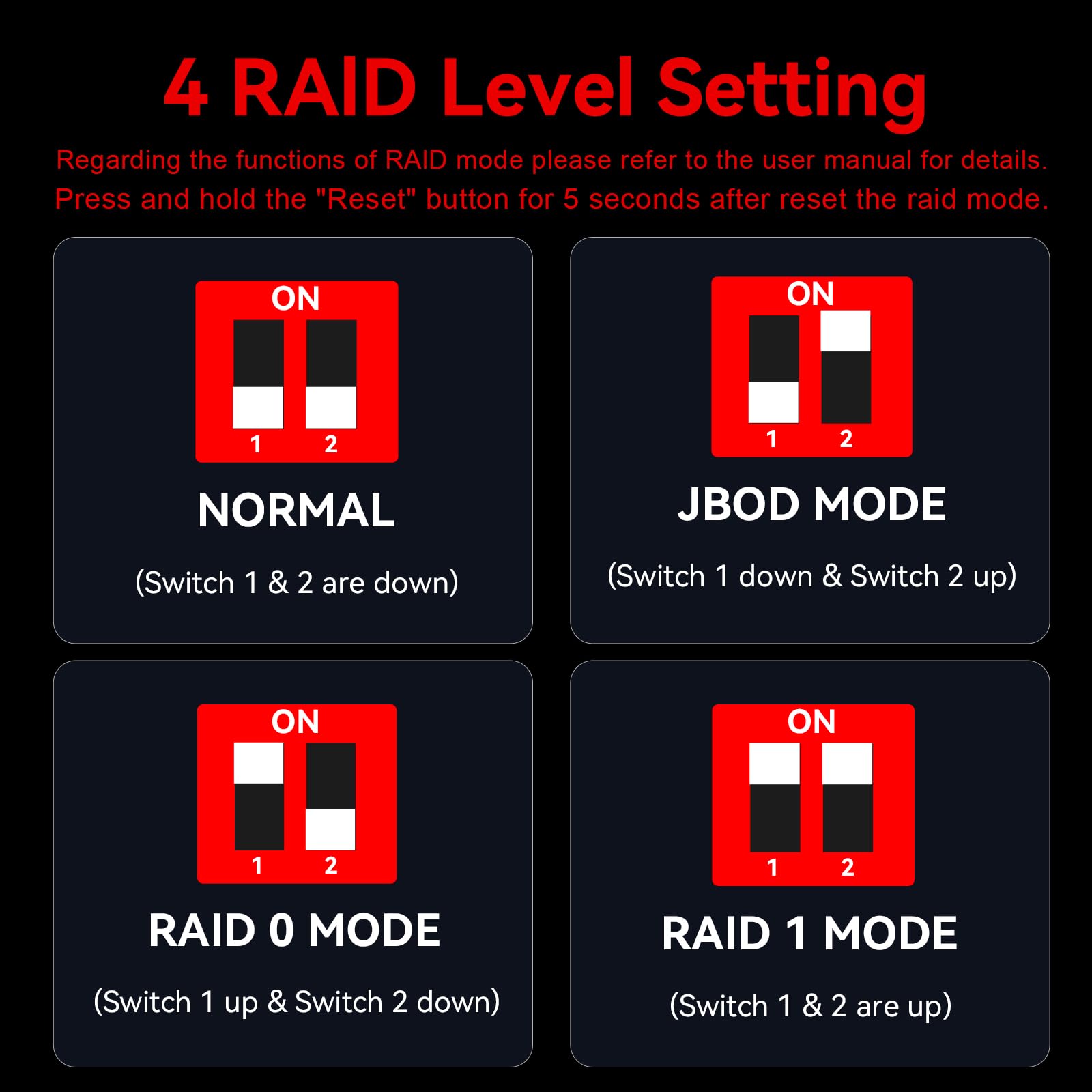 - Flexible RAID-Modi: Bietet vier Konfigurationsmöglichkeiten (RAID 0, RAID 1, JBOD, Normal), um die Leistung, die Datensicherheit oder die individuelle Nutzung der Laufwerke zu optimieren.