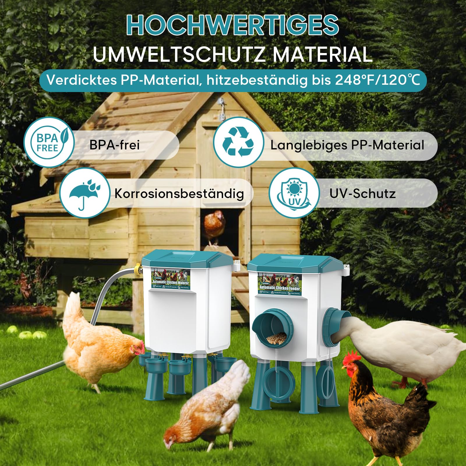Sparen Sie Zeit und Aufwand: Versorgen Sie Ihre Herde effizient und gewinnen Sie wertvolle Zeit. Dieses System ist ideal für Personen mit einem vollen Terminkalender, da es Ihre Hühner gut genährt und hydriert hält, ohne dass Sie täglich nachfüllen müssen.
