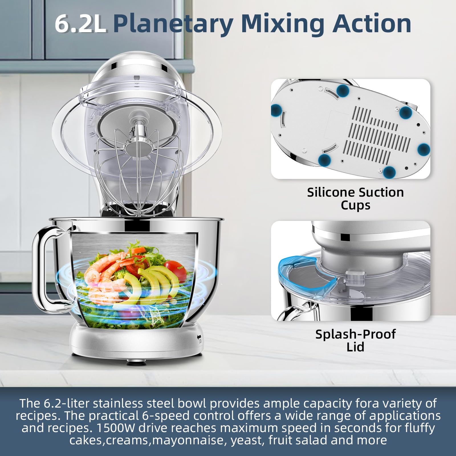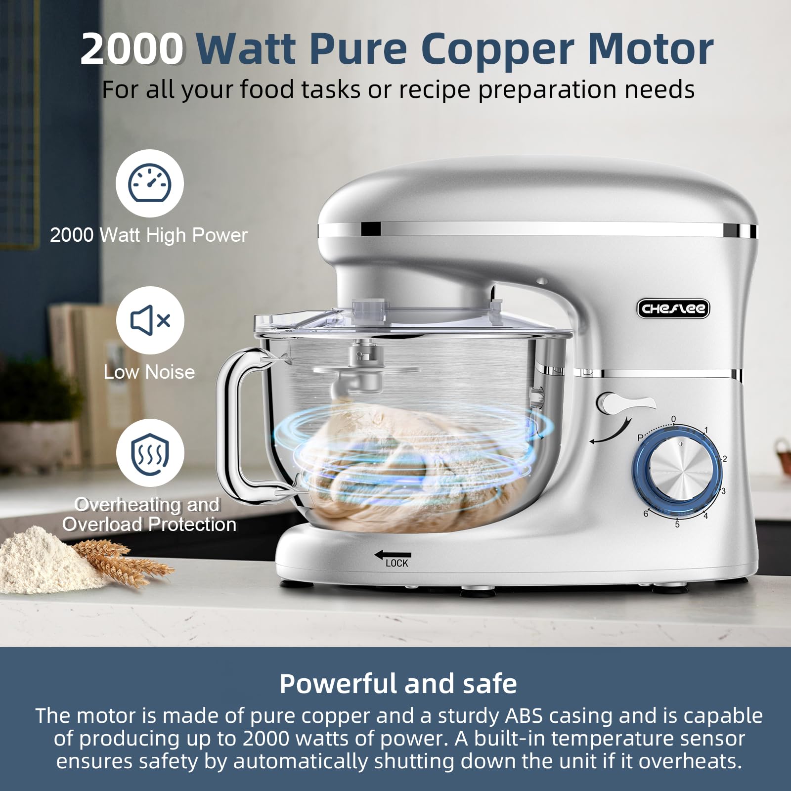 CHeflee Küchenmaschine Teigmaschine 2000W Knetmaschine,Mit 6.2L EdelstahlschüSsel,6 Geschwindigkeit Reduzierte GeräUsche,Mit RüHrbesen,RüHrhaken,SpritzwassergeschüTzter Knetmaschine Mit Knethaken