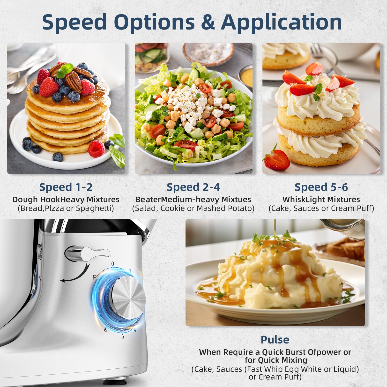 Die Maschine bietet maximale Kontrolle durch sechs präzise einstellbare Geschwindigkeitsstufen. Zusätzlich gibt es eine Pulsfunktion, die ideal für kurzes, kraftvolles Unterrühren oder das schonende Einarbeiten von Zutaten ist, sodass Sie für jedes Rezept die perfekte Einstellung finden.